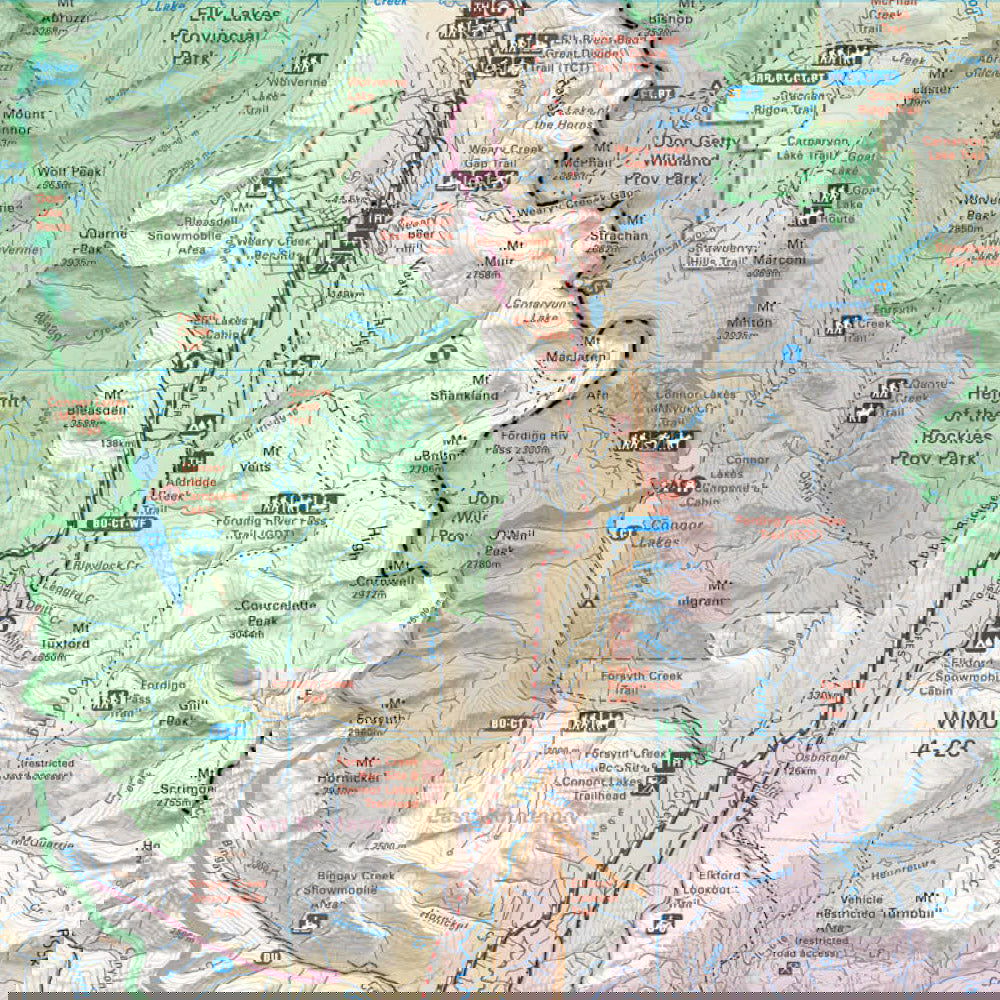 The PDF bundle includes large and small scale topographic maps, including a detailed park overview map and trail map of the Connor Lakes area, making it easy to find the Height of the Rockies destination you are looking for. The 9 page booklet also highlights Things to Know, Things to See & Do, contact information, places to camp or stay, day-use areas, and countless recreational activities for things like fishing, trails, paddling, rock climbing, wildlife viewing and winter sports. Covering Height of the Rockies Provincial Park like no other guidebook or map, this is the perfect guide to get you away from it all!