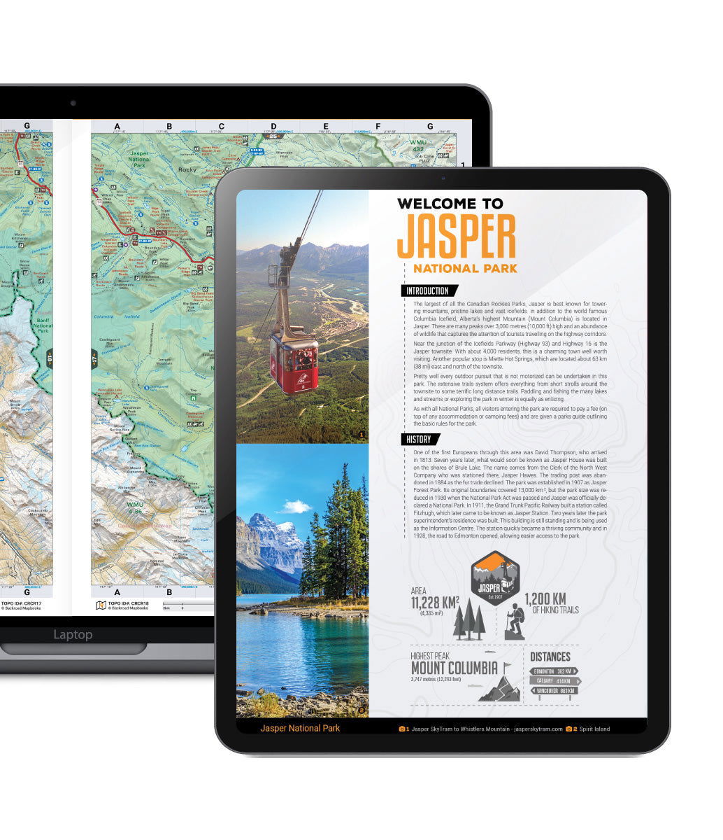 The PDF booklets are zoomable for easier reading of small text, lightweight and easily carried with you. Featuring all of the park information found in the Canadian Rockies Backroad Mapbook in one downloadable booklet, they are a must have on any park adventure. Features include: