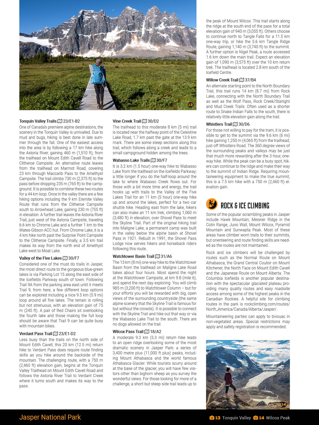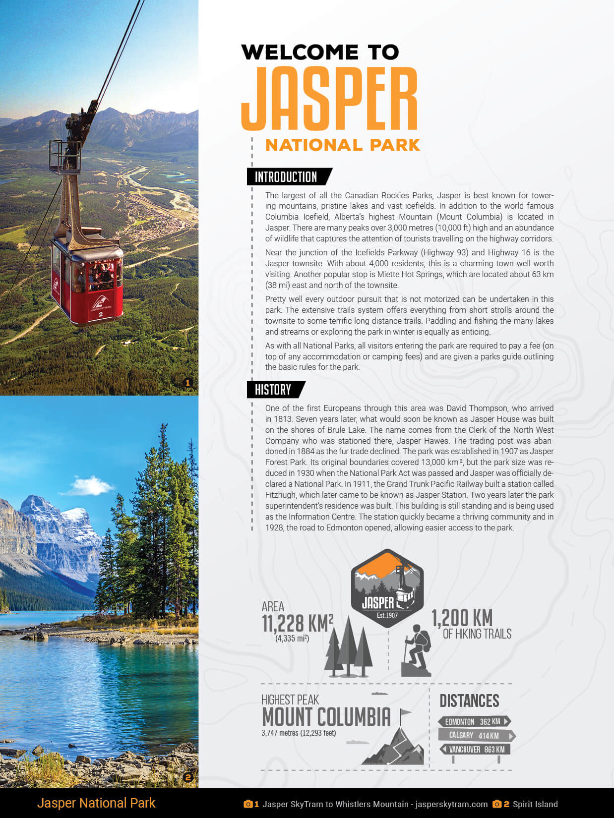 Jasper National Park is the largest of the Canadian Rockies Parks, at 11,000 km_ (4,247 square miles). Jasper has no shortage of towering peaks, colourful alpine meadows, rushing rivers and mesmerizing mountain lakes for which the Canadian Rockies wilderness is famous. From the historic townsite of Jasper to wandering the picturesque meadow trail, to the base of Mount Edith Cavell, hiking Maligne Canyon, rafting the Athabasca River, practicing the sound of music at the top of WhistlerÃ_x0095_s Mountain or trekking the Skyline Trail, Jasper National Park is a must-see outdoor enthusiasts destination. Mountaineering and ice climbing in Jasper National Park is second to none, including AlbertaÃ_x0095_s tallest mountain, Mount Columbia, and our PDF booklet will smoothly guide you to the climbing hotspots on Mount Athabasca, Mount Kitchener and others.