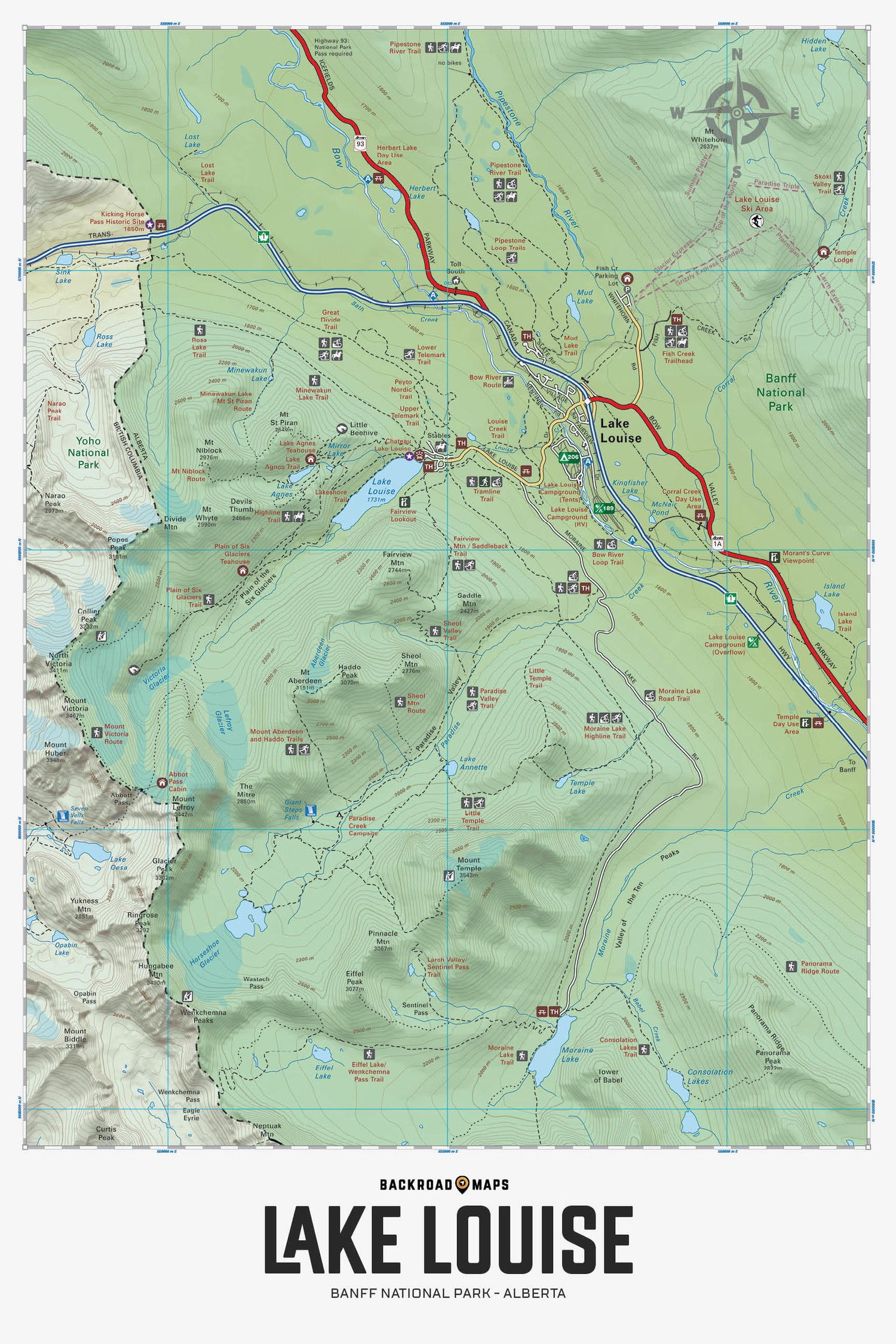 Focusing on the Lake Louise area within Banff National Park Alberta, this BRMB Adventure topographic map highlights all the roads, fishing lakes and rivers, campgrounds, backcountry campsites, viewpoints, trails for hiking, mountain biking, cross-country skiing, snowshoeing and horseback riding, downhill ski areas, picnic sites, paddling routes, waterfalls and more! No other map provides as much recreational information and topographic detail around the Lake Louise city area as this one. This Adventure map features our industry-leading topographic contours and relief shading and charts the areas of Lake Louise, Bow River, Fairview Mountain, Great Divide Trail, Lake Agnes, Lake Annette, Lake Louise Ski Area, Moraine Lake Road, Mount Aberdeen, Mount St. Piran, Mud Lake, Paradise Valley, Pipestone River, Plain of Six Glaciers Trail and more!