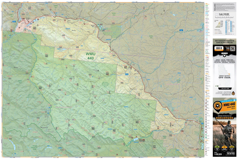 This topographic hunting map covers the Adams Creek area Wildlife Management Unit 440 in central Alberta. Featuring 1:50,000 scale water and road data from the popular Backroad Mapbook series, the maps clearly mark Wildlife Management Units, along with, Crown land areas, provincial grazing reserves and public land use zones. Updated road and trail systems, recreational points of interest, campsites, fish species and more make these the most detailed hunting maps available on the market. WMU 440 covers the area from Grande Cache in the northwest south along the Sulphur River dissecting Willmore Wilderness Park before heading east on the height of land at Vega Peak at the Jasper National Park boundary where it follows Willmore Wilderness Park boundary to Wildhay River and continues east to the bridge on the Bighorn Highway 40 where it follows the road north back to Grande Cache.