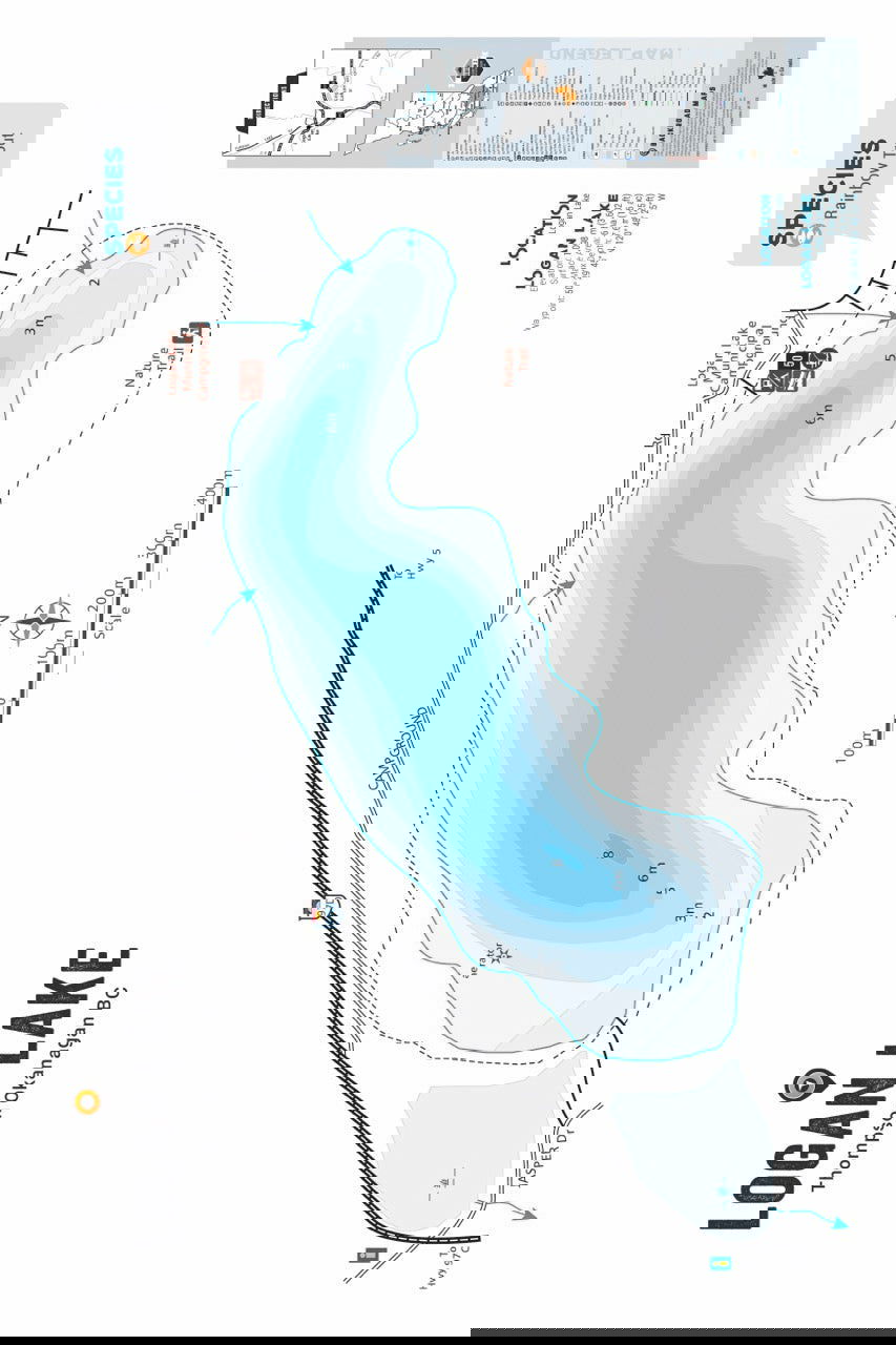 This Fishing Chart covers Logan Lake on Thompson Okanagan, BC. Resting in BC Fishing Region 3, the map features the lake bathymetry (or lake depths) and shore features including boat launches, campsites, fishing docks, parks and resorts. In addition to road or trail access points, the map also includes the lake location and information such as elevation, surface area, mean and maximum depth, and waypoint. Additional features include the fish species found in the lake, an area indicator or map key, scale bar and map legend.