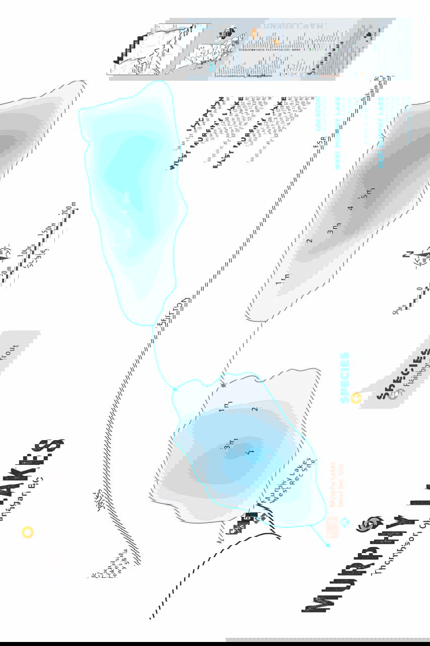 This Fishing Chart covers Murphy Lakes on Thompson Okanagan, BC. Resting in BC Fishing Region 8, the map features the lake bathymetry (or lake depths) and shore features including boat launches, campsites, fishing docks, parks and resorts. In addition to road or trail access points, the map also includes the lake location and information such as elevation, surface area, mean and maximum depth, and waypoint. Additional features include the fish species found in the lake, an area indicator or map key, scale bar and map legend.