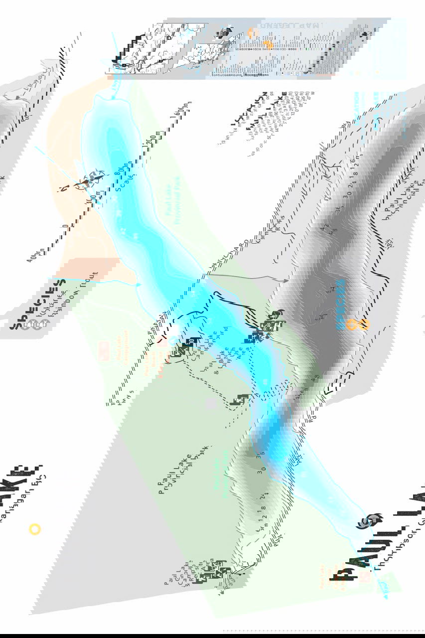 This Fishing Chart covers Paul Lake on Thompson Okanagan, BC. Resting in BC Fishing Region 3, the map features the lake bathymetry (or lake depths) and shore features including boat launches, campsites, fishing docks, parks and resorts. In addition to road or trail access points, the map also includes the lake location and information such as elevation, surface area, mean and maximum depth, and waypoint. Additional features include the fish species found in the lake, an area indicator or map key, scale bar and map legend.