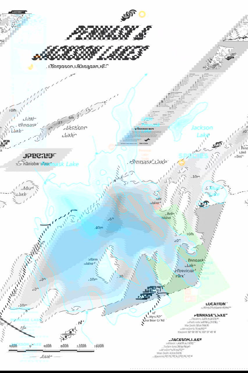 This Fishing Chart covers Pennask & Jackson Lakes on Thompson Okanagan, BC. Resting in BC Fishing Region 3, the map features the lake bathymetry (or lake depths) and shore features including boat launches, campsites, fishing docks, parks and resorts. In addition to road or trail access points, the map also includes the lake location and information such as elevation, surface area, mean and maximum depth, and waypoint. Additional features include the fish species found in the lake, an area indicator or map key, scale bar and map legend.