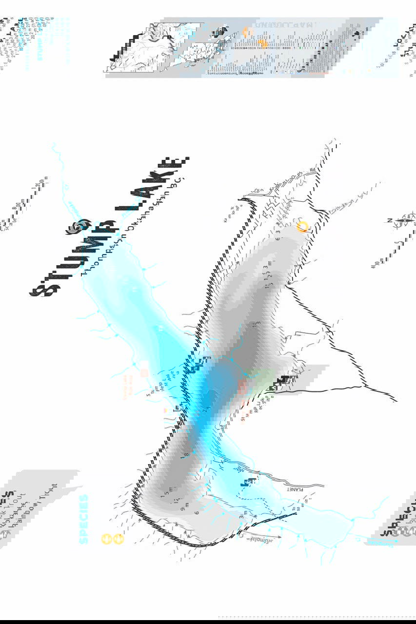 This Fishing Chart covers Stump Lake - Merritt on Thompson Okanagan, BC. Resting in BC Fishing Region 3, the map features the lake bathymetry (or lake depths) and shore features including boat launches, campsites, fishing docks, parks and resorts. In addition to road or trail access points, the map also includes the lake location and information such as elevation, surface area, mean and maximum depth, and waypoint. Additional features include the fish species found in the lake, an area indicator or map key, scale bar and map legend.