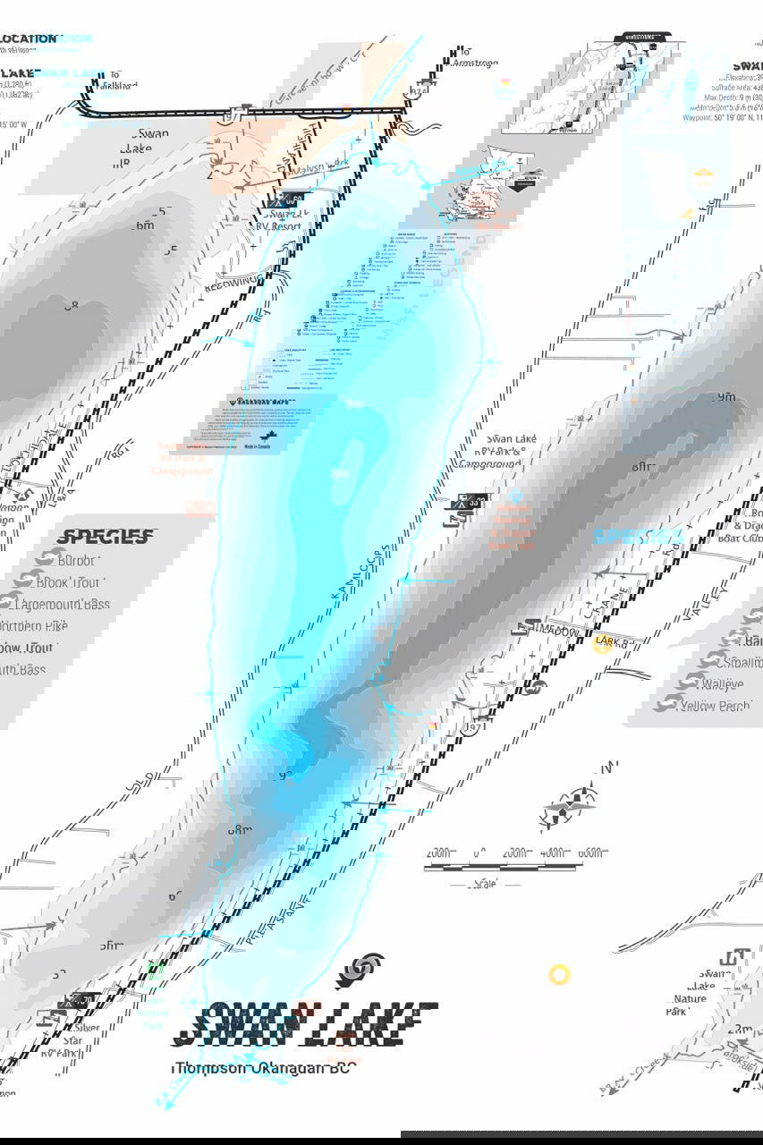 This Fishing Chart covers Swan Lake - Vernon on Thompson Okanagan, BC. Resting in BC Fishing Region 8, the map features the lake bathymetry (or lake depths) and shore features including boat launches, campsites, fishing docks, parks and resorts. In addition to road or trail access points, the map also includes the lake location and information such as elevation, surface area, mean and maximum depth, and waypoint. Additional features include the fish species found in the lake, an area indicator or map key, scale bar and map legend.