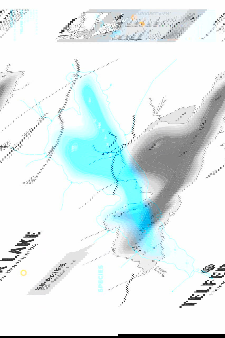 This Fishing Chart covers Telfer Lake on Thompson Okanagan, BC. Resting in BC Fishing Region 3, the map features the lake bathymetry (or lake depths) and shore features including boat launches, campsites, fishing docks, parks and resorts. In addition to road or trail access points, the map also includes the lake location and information such as elevation, surface area, mean and maximum depth, and waypoint. Additional features include the fish species found in the lake, an area indicator or map key, scale bar and map legend.