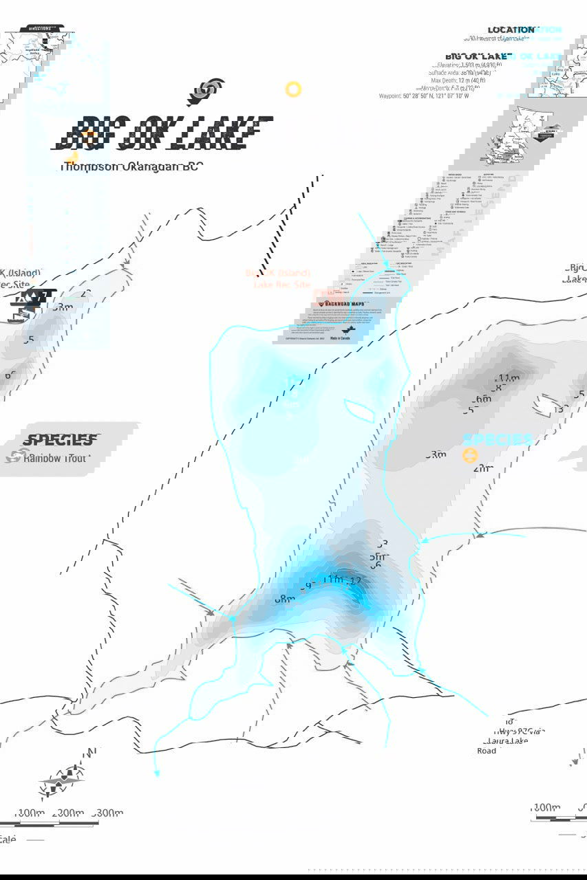 This Fishing Chart covers Big OK Lake on Thompson Okanagan, BC. Resting in BC Fishing Region 3, the map features the lake bathymetry (or lake depths) and shore features including boat launches, campsites, fishing docks, parks and resorts. In addition to road or trail access points, the map also includes the lake location and information such as elevation, surface area, mean and maximum depth, and waypoint. Additional features include the fish species found in the lake, an area indicator or map key, scale bar and map legend.