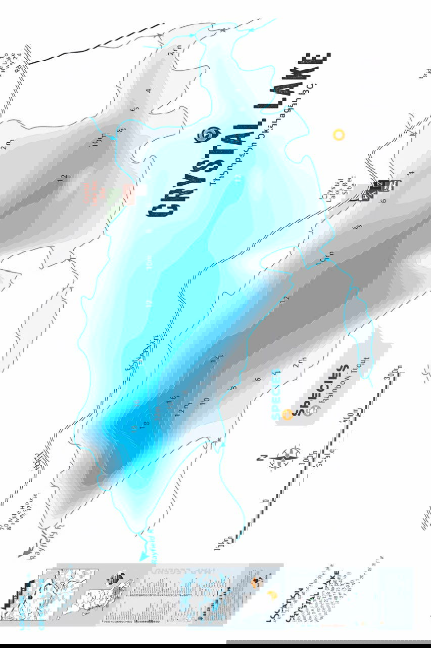 This Fishing Chart covers Crystal Lake on Thompson Okanagan, BC. Resting in BC Fishing Region 3, the map features the lake bathymetry (or lake depths) and shore features including boat launches, campsites, fishing docks, parks and resorts. In addition to road or trail access points, the map also includes the lake location and information such as elevation, surface area, mean and maximum depth, and waypoint. Additional features include the fish species found in the lake, an area indicator or map key, scale bar and map legend.