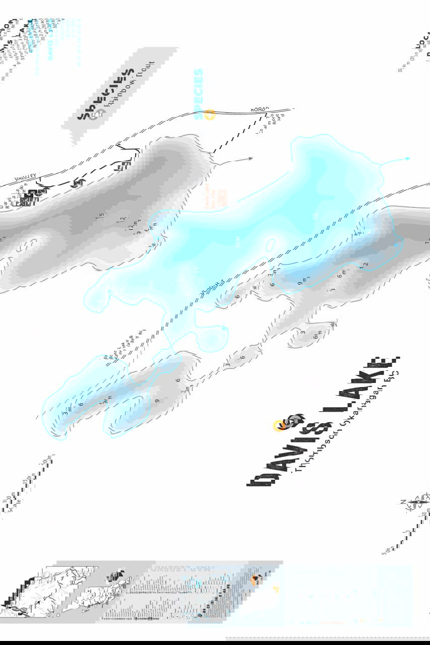 This Fishing Chart covers Davis Lake on Thompson Okanagan, BC. Resting in BC Fishing Region 8, the map features the lake bathymetry (or lake depths) and shore features including boat launches, campsites, fishing docks, parks and resorts. In addition to road or trail access points, the map also includes the lake location and information such as elevation, surface area, mean and maximum depth, and waypoint. Additional features include the fish species found in the lake, an area indicator or map key, scale bar and map legend.