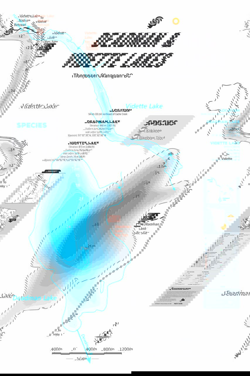 This Fishing Chart covers Deadman & Vidette Lakes on Thompson Okanagan, BC. Resting in BC Fishing Region 3, the map features the lake bathymetry (or lake depths) and shore features including boat launches, campsites, fishing docks, parks and resorts. In addition to road or trail access points, the map also includes the lake location and information such as elevation, surface area, mean and maximum depth, and waypoint. Additional features include the fish species found in the lake, an area indicator or map key, scale bar and map legend.