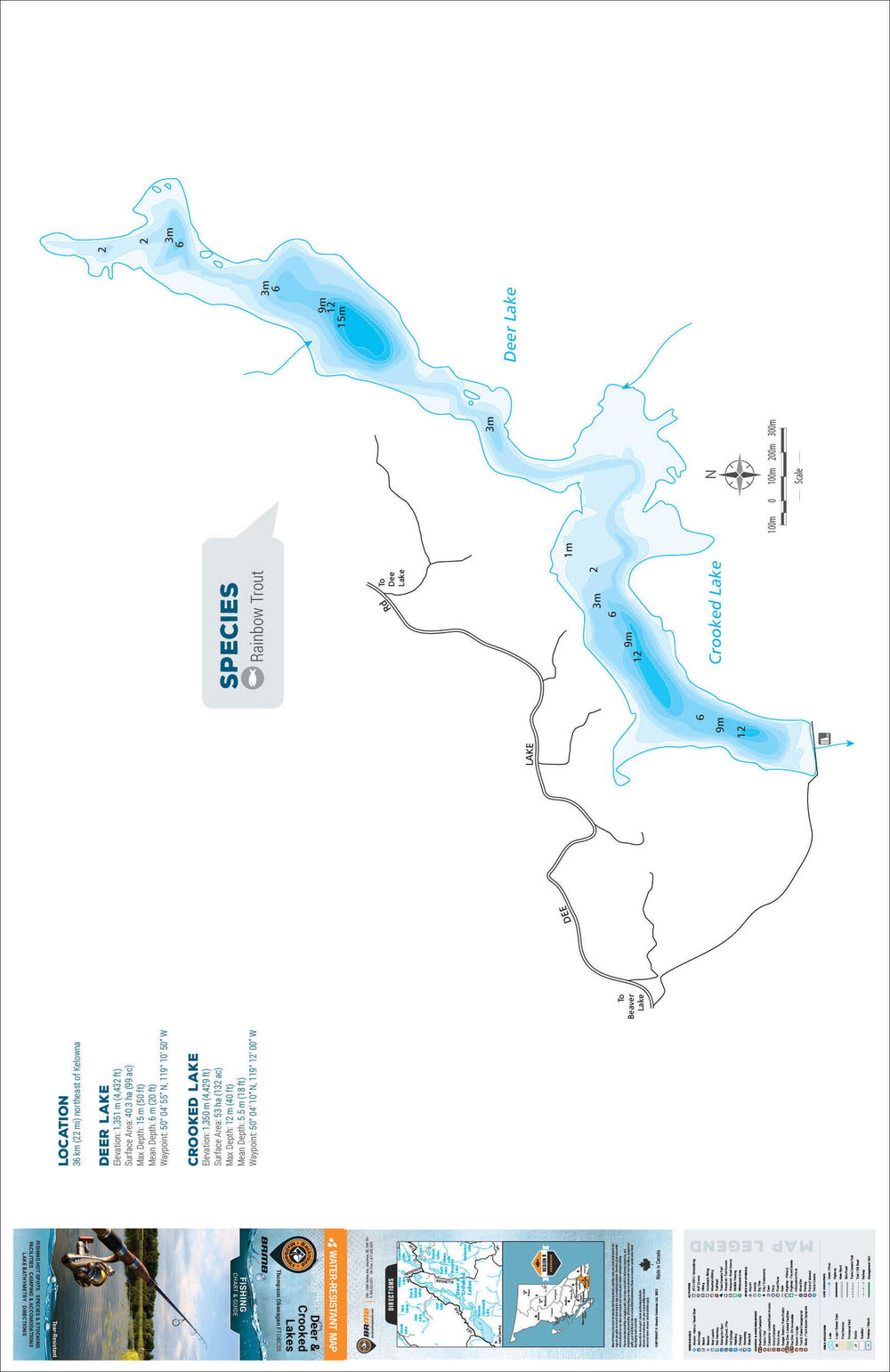 This Fishing Chart covers Deer & Crooked Lakes on Thompson Okanagan, BC. Resting in BC Fishing Region 8, the map features the lake bathymetry (or lake depths) and shore features including boat launches, campsites, fishing docks, parks and resorts. In addition to road or trail access points, the map also includes the lake location and information such as elevation, surface area, mean and maximum depth, and waypoint. Additional features include the fish species found in the lake, an area indicator or map key, scale bar and map legend.