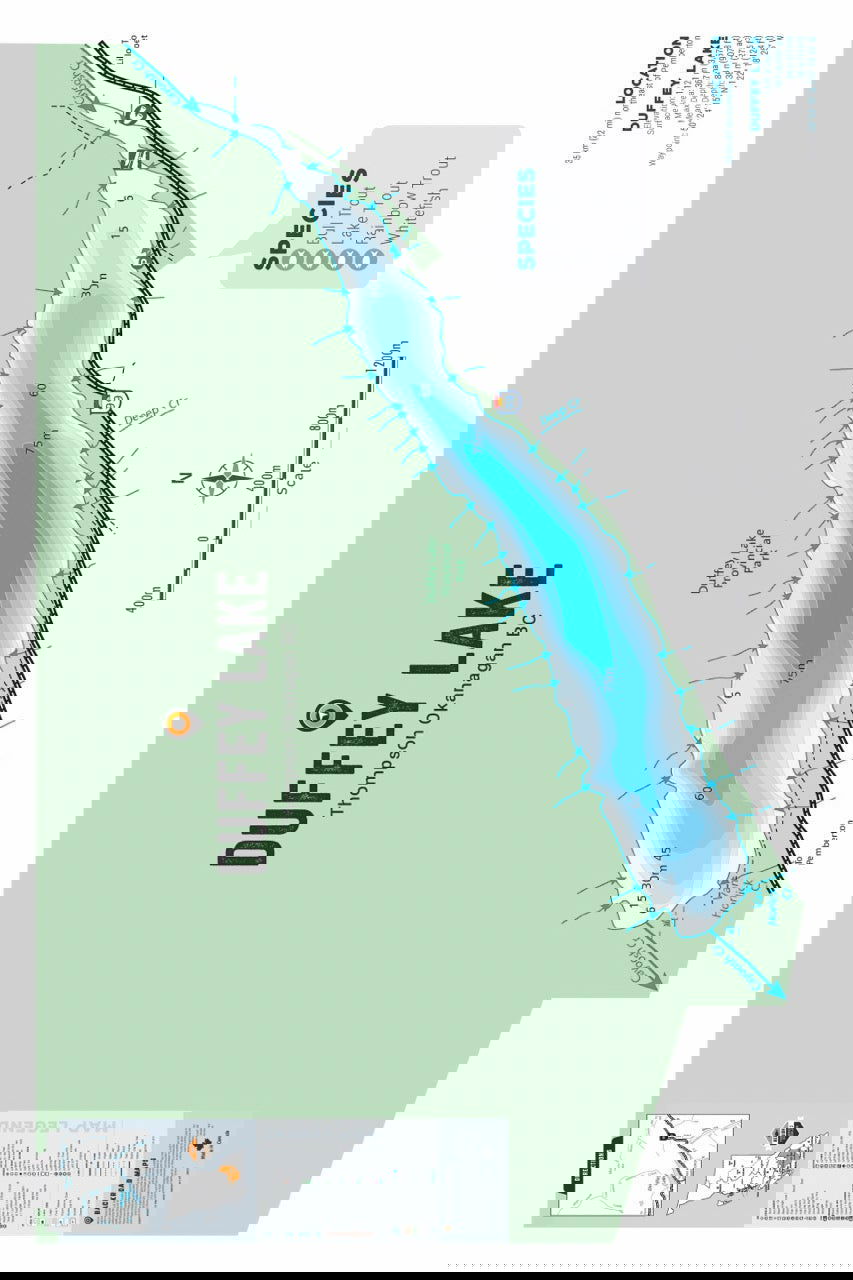 This Fishing Chart covers Duffey Lake on Thompson Okanagan, BC. Resting in BC Fishing Region 3, the map features the lake bathymetry (or lake depths) and shore features including boat launches, campsites, fishing docks, parks and resorts. In addition to road or trail access points, the map also includes the lake location and information such as elevation, surface area, mean and maximum depth, and waypoint. Additional features include the fish species found in the lake, an area indicator or map key, scale bar and map legend.