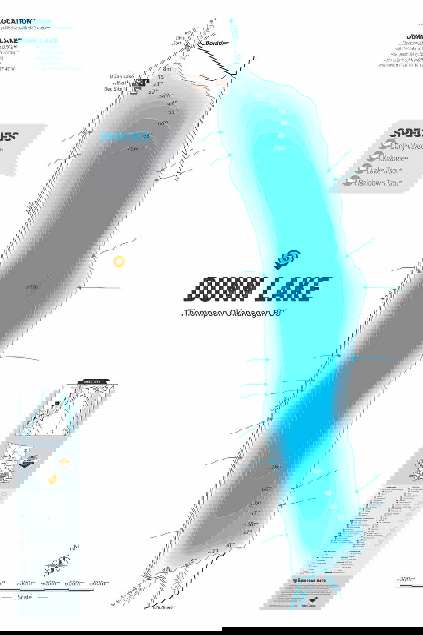 This Fishing Chart covers Dunn Lake on Thompson Okanagan, BC. Resting in BC Fishing Region 3, the map features the lake bathymetry (or lake depths) and shore features including boat launches, campsites, fishing docks, parks and resorts. In addition to road or trail access points, the map also includes the lake location and information such as elevation, surface area, mean and maximum depth, and waypoint. Additional features include the fish species found in the lake, an area indicator or map key, scale bar and map legend.
