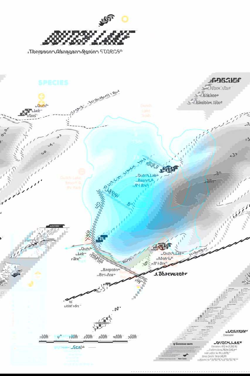 This Fishing Chart covers Dutch Lake on Thompson Okanagan, BC. Resting in BC Fishing Region 3, the map features the lake bathymetry (or lake depths) and shore features including boat launches, campsites, fishing docks, parks and resorts. In addition to road or trail access points, the map also includes the lake location and information such as elevation, surface area, mean and maximum depth, and waypoint. Additional features include the fish species found in the lake, an area indicator or map key, scale bar and map legend.