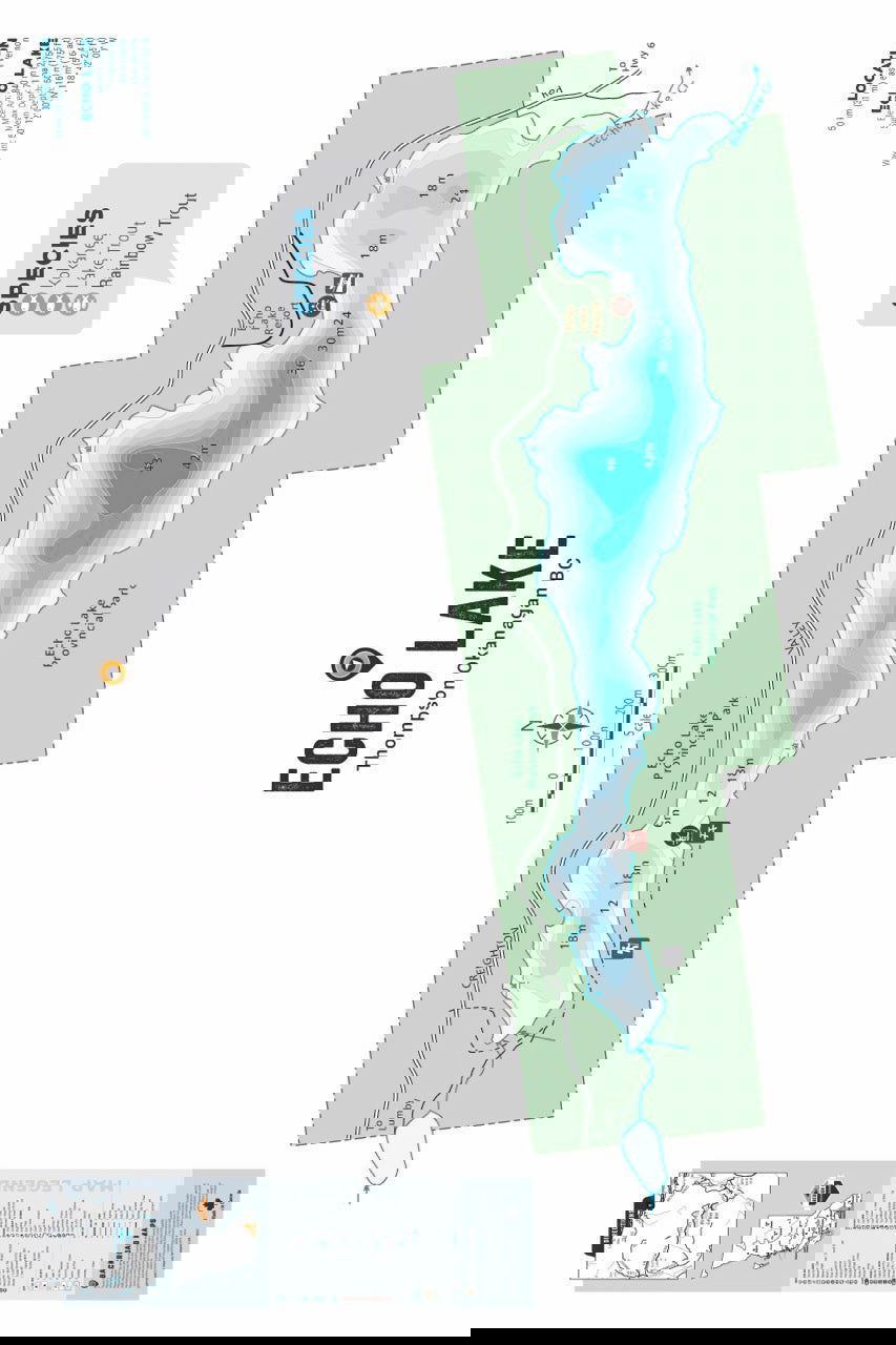 This Fishing Chart covers Echo Lake on Thompson Okanagan, BC. Resting in BC Fishing Region 8, the map features the lake bathymetry (or lake depths) and shore features including boat launches, campsites, fishing docks, parks and resorts. In addition to road or trail access points, the map also includes the lake location and information such as elevation, surface area, mean and maximum depth, and waypoint. Additional features include the fish species found in the lake, an area indicator or map key, scale bar and map legend.