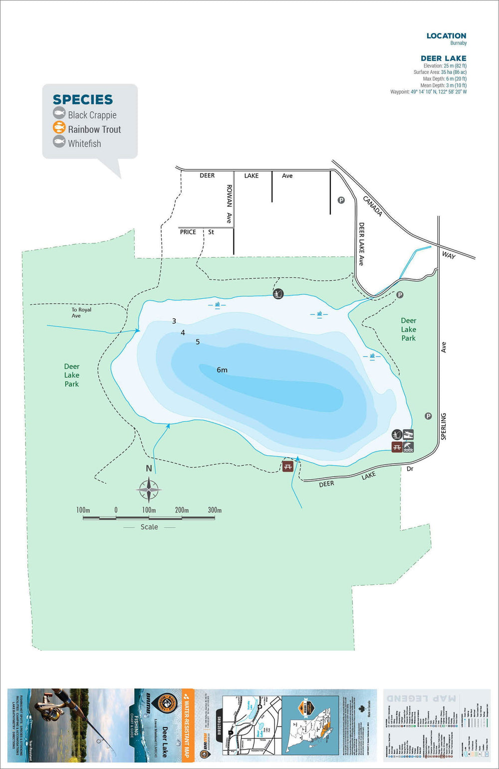 This Fishing Chart covers Deer Lake - Burnaby Area on Lower Mainland, BC. Resting in BC Fishing Region 2, the map features the lake bathymetry (or lake depths) and shore features including boat launches, campsites, fishing docks, parks and resorts. In addition to road or trail access points, the map also includes the lake location and information such as elevation, surface area, mean and maximum depth, and waypoint. Additional features include the fish species found in the lake, an area indicator or map key, scale bar and map legend.