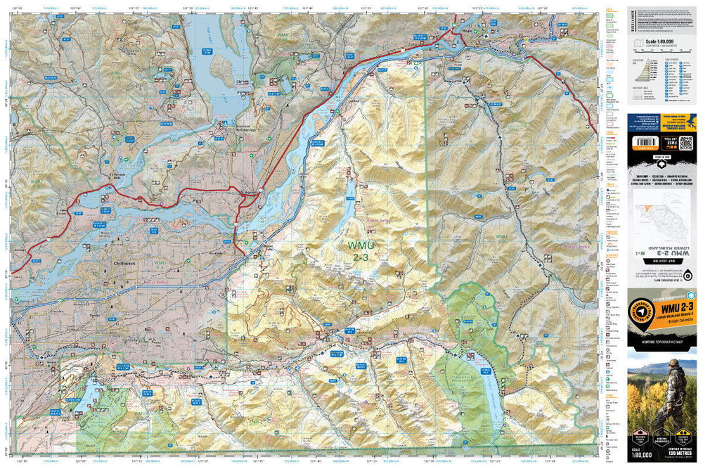 This topographic hunting map covers Wildlife Management Unit 2-3 in southern British Columbia. Featuring 1:20,000 scale water and road data from the popular Backroad Mapbook series, the maps clearly mark Wildlife Management Units, along with private land areas, Indian reserves and park areas. Updated road and trail systems, recreational points of interest, campsites, fish species and more make these the most detailed hunting maps available on the market. From Hope, WMU 2-3 heads directly south before wrapping around the western boundaries of Chilliwack Lake Provincial Park and continuing to the United States border. The WMU follows the border to just west of Cultus Lake Provincial Park where it jogs north to the Chilliwack River, east to Slesse Park and then north through Bridal Falls to the Fraser River, heading northeast back to Hope.