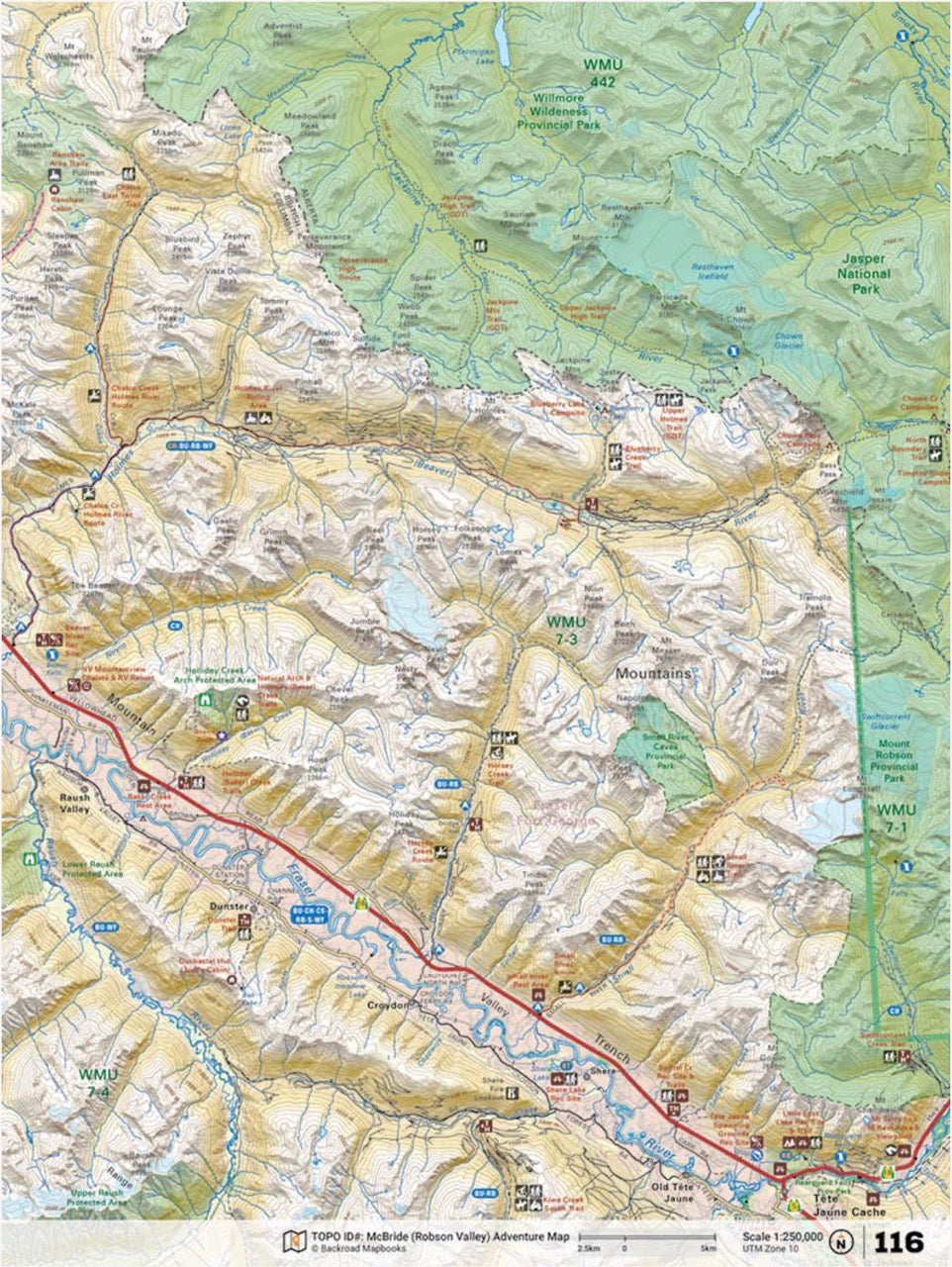 This recreation topographic map for the Tete Juane Cache area highlights all the logging roads, trails and recreational Points of Interest including hunting, camping, hiking, mountain biking, canoeing, kayaking, backcountry skiing, snowshoeing, cross-country skiing, wildlife viewing, ATVing, snowmobiling and more. No other map for the area provides you with this level of recreational or topographic detail. Special features include private land and countless roads, trails and recreational Points of Interest. Covering 1,950 km2 (750 mi2) in total, this 1:85,000 scale map measures 38 x 51 km (23.5 x 32 mi) and includes the Robson Valley, Tete Juane Cache, Mount Robson Provincial Park, Small River Caves Provincial Park, Willmore Wilderness Provincial Park and more! This map also covers the following Wildlife Management Units: WMU 7-1 Omineca, WMU 7-3 Omineca, WMU 7-4 Omineca, WMU 442 Alberta.