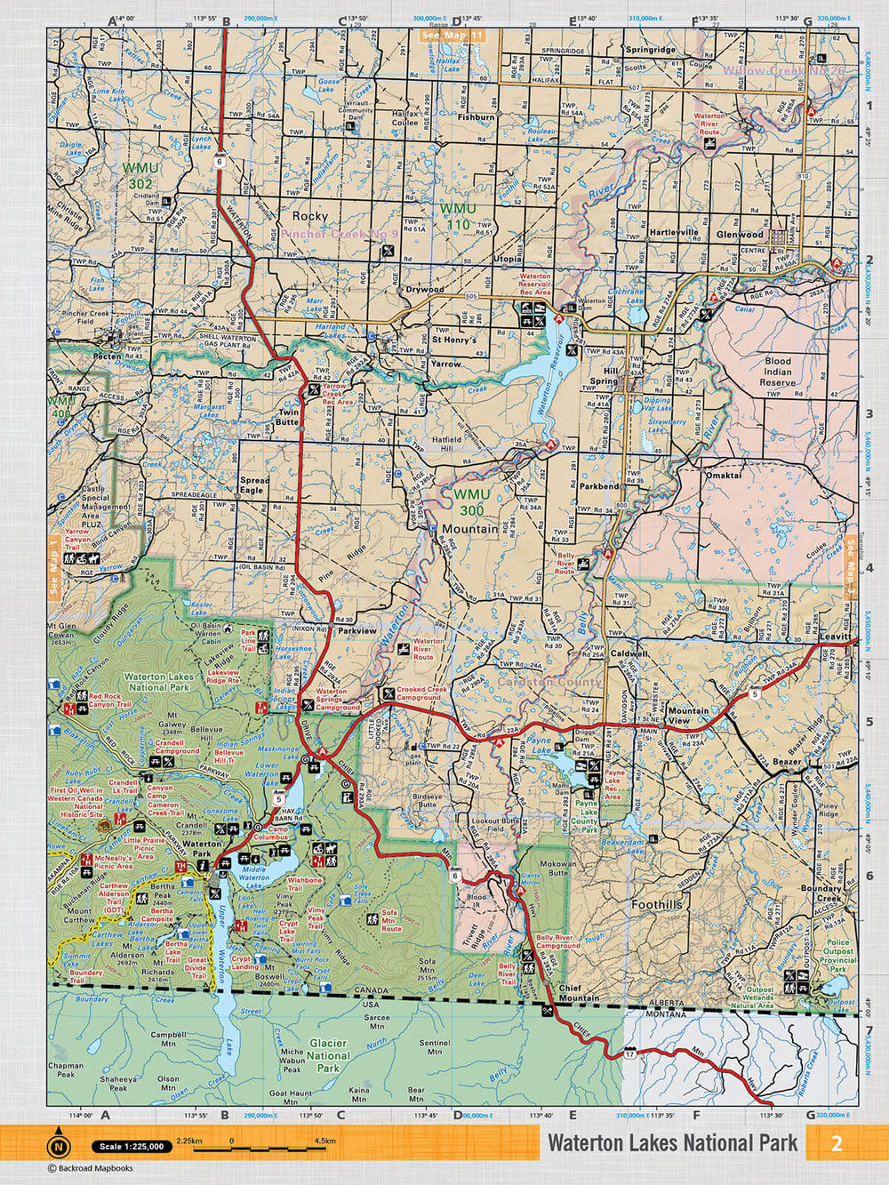 This recreation topographic map for the Waterton Lakes National Park area highlights all the logging and resource roads, multi-use trails for hikers, mountain bikers, horseback riders, cross-country skiers and snowshoers, motorized trails for ATVers and snowmobilers, fishing lakes and rivers, recreation areas, campgrounds, day-use areas, viewpoints, backcountry campsites, work camps, oil & gas sites, backcountry huts and cabins and more. No other map for the area provides you with this level of recreational or topographic detail. Covering 2,465 km2 (950 mi2) in total, this 1:75,000 scale map measures 43 x 57 km (27 x 35.5 mi). Special features include Crown Forest Management Areas, Public Land Use Zones, labelled fish species, enhanced oil & gas data and countless roads, trails and recreational Points of Interest. This map includes Waterton Reservoir, Waterton Lakes National Park, Blood Indian Reserve, Payne Lake, Beazer, Police Outpost Prov Park, Yarrow, Belly River, Waterton River, Glenwood and more!