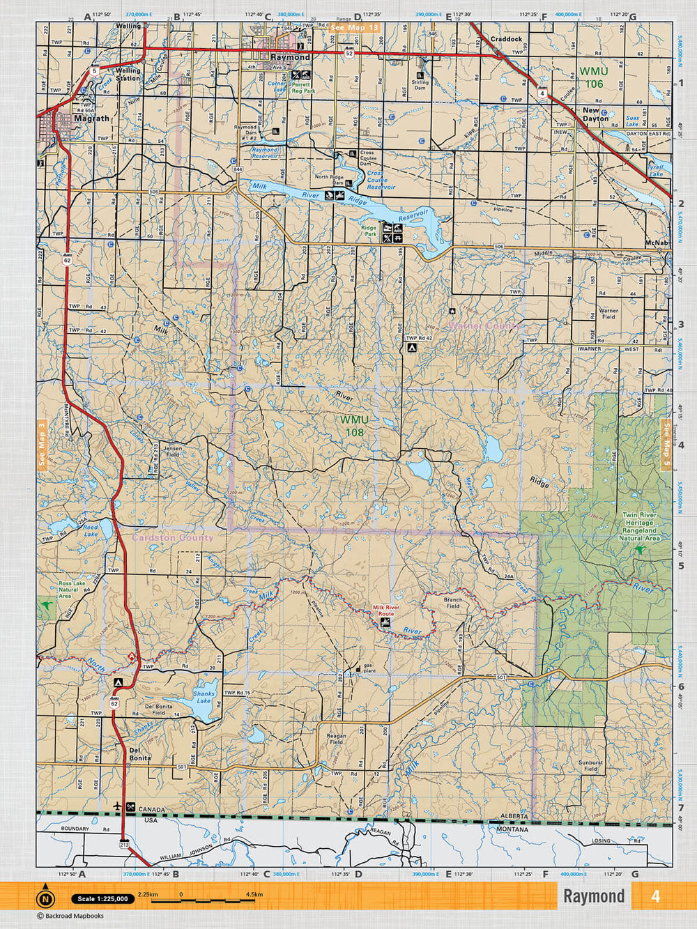 This recreation topographic map for the Raymond area highlights all the logging and resource roads, multi-use trails for hikers, mountain bikers, horseback riders, cross-country skiers and snowshoers, motorized trails for ATVers and snowmobilers, fishing lakes and rivers, recreation areas, campgrounds, day-use areas, viewpoints, backcountry campsites, work camps, oil & gas sites, backcountry huts and cabins and more. No other map for the area provides you with this level of recreational or topographic detail. Covering 2,465 km2 (950 mi2) in total, this 1:75,000 scale map measures 43 x 57 km (27 x 35.5 mi). Special features include Crown Forest Management Areas, Public Land Use Zones, labelled fish species, enhanced oil & gas data and countless roads, trails and recreational Points of Interest. This map includes Twin River Heritage Rangeland Natural Area, Milk River Ridge Reservoir, Raymond, Magrath, New Dayton, Shanks Lake, Del Bonita, North Milk River, Milk River, Ridge Regional Park and more!