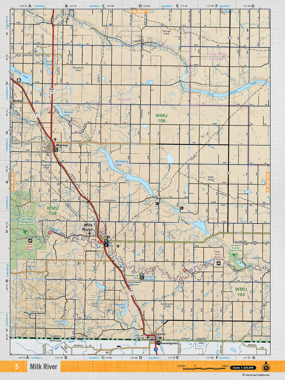 This recreation topographic map for the Milk River area highlights all the logging and resource roads, multi-use trails for hikers, mountain bikers, horseback riders, cross-country skiers and snowshoers, motorized trails for ATVers and snowmobilers, fishing lakes and rivers, recreation areas, campgrounds, day-use areas, viewpoints, backcountry campsites, work camps, oil & gas sites, backcountry huts and cabins and more. No other map for the area provides you with this level of recreational or topographic detail. Covering 2,465 km2 (950 mi2) in total, this 1:75,000 scale map measures 43 x 57 km (27 x 35.5 mi). Special features include Crown Forest Management Areas, Public Land Use Zones, labelled fish species, enhanced oil & gas data and countless roads, trails and recreational Points of Interest. This map includes Milk River, Verdigris Lake, Crow Indian Lake, Goldsprings Park, Warner, Tyrrell Lake, Coutts, Twin River Heritage Rangeland Natural Area, Verdigris Coulee Natural Area, McNab and more!