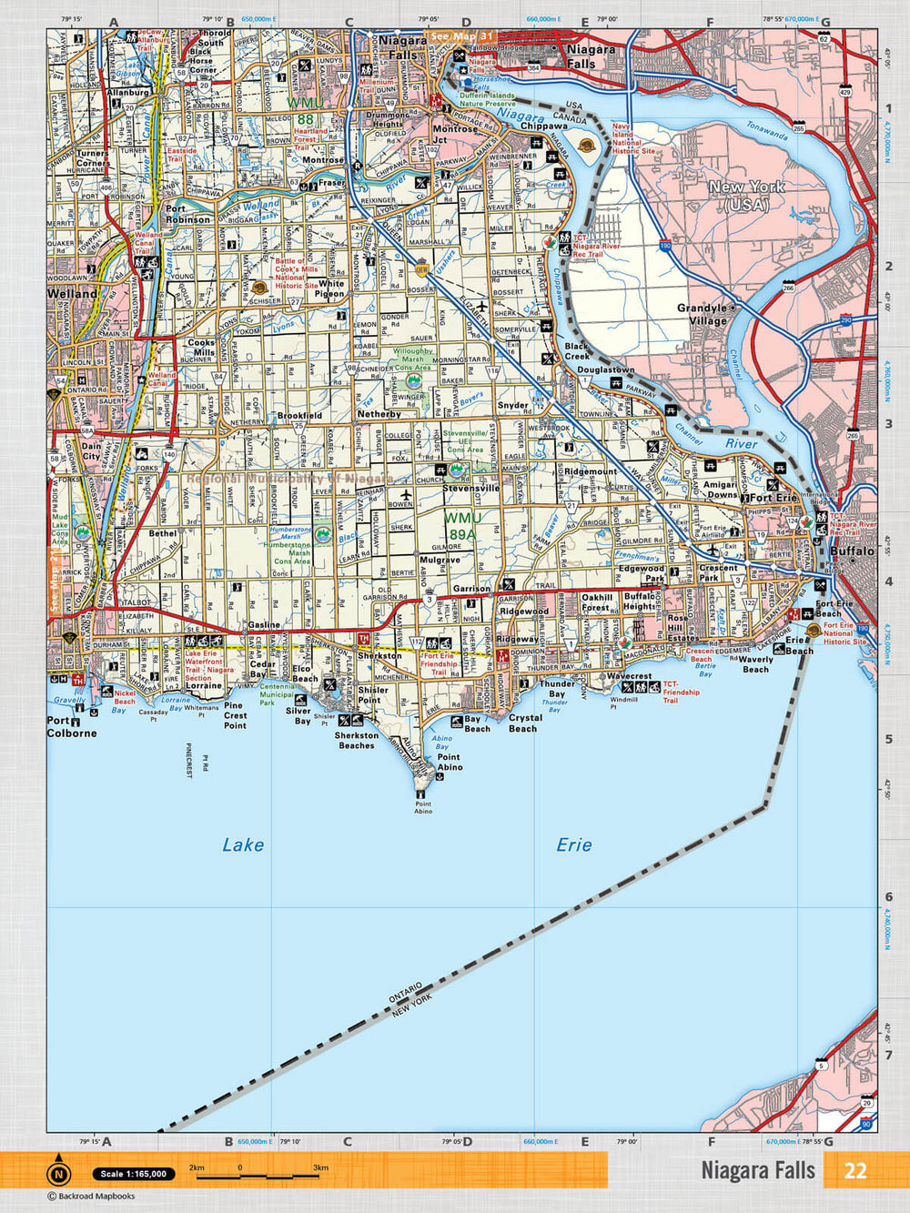 This recreation topographic map for Niagra Falls highlights all the logging/resource roads, hunting areas, fishing lakes & streams, campsites, paddling routes for canoeing and kayaking, wildlife viewing areas, multi-use trails for hiking, biking, horseback riding, cross-country skiing and snowshoeing, motorized trails for ATVing and snowmobiling & more. Covering 1,325 km2 (510 mi2), this 1:55,000 scale map measures 31.5 x 42 km (19.5 x 26 mi), providing you with more topographic and recreational detail for the Detroit River area than any other map on the market. New features include expanded road and trail data and countless recreational Points of Interest. Included on this map are Lake Erie, Niagara River, Niagara Falls, Fort Erie, Dain City, Welland Canal, Power Canal, Allanburg, Welland River, Netherby and more!