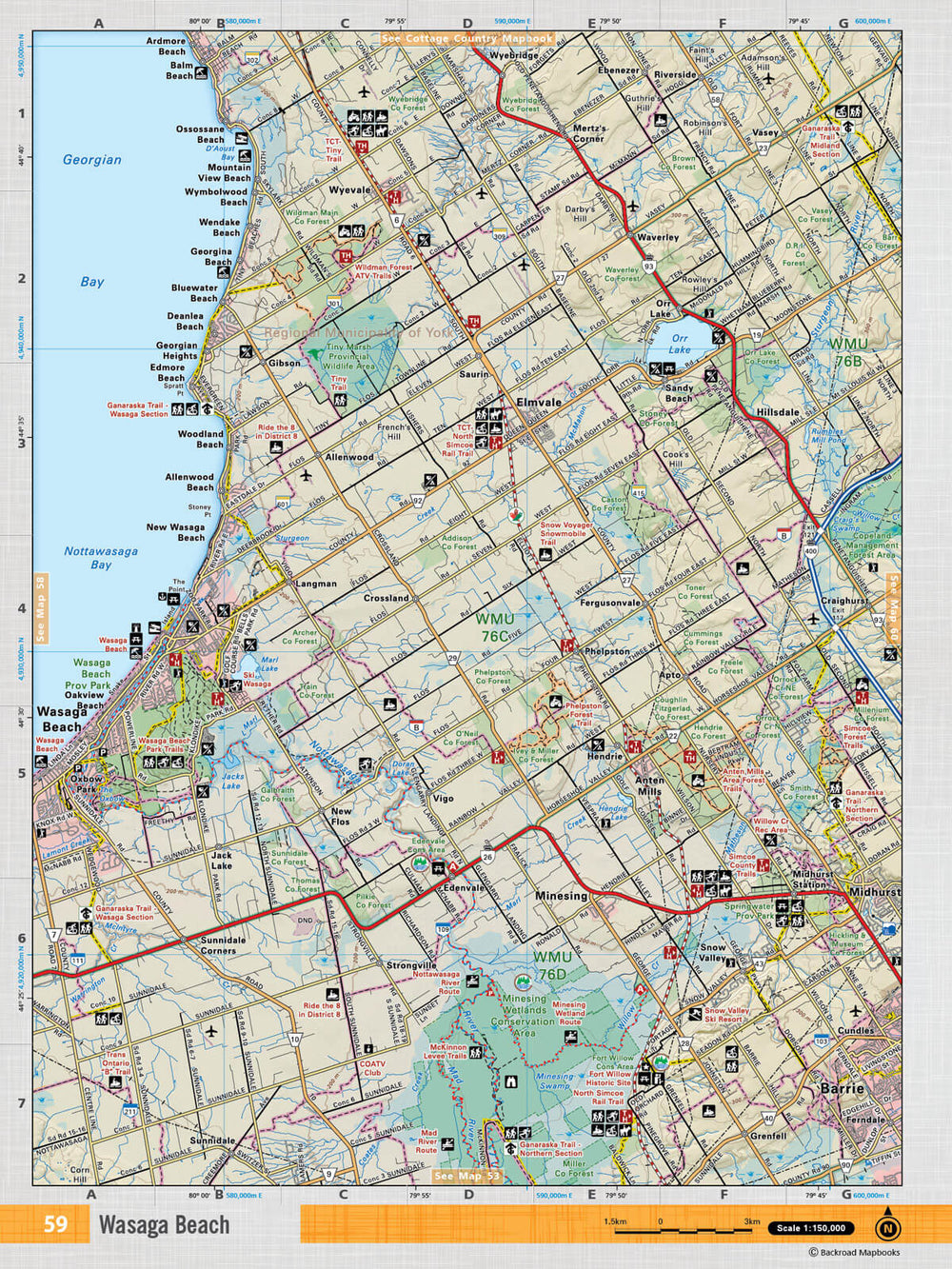 This recreation topographic map for Wasaga Beach highlights all the logging/resource roads, hunting areas, fishing lakes & streams, campsites, paddling routes for canoeing and kayaking, wildlife viewing areas, multi-use trails for hiking, biking, horseback riding, cross-country skiing and snowshoeing, motorized trails for ATVing and snowmobiling & more. Covering 1,090 km2 (420 mi2), this 1:50,000 scale map measures 29 x 38 km (18 x 24 mi), providing you with more topographic and recreational detail for the Niagara-on-the-Lake area than any other map on the market. New features include expanded road and trail data and countless recreational Points of Interest. Included on this map are Georgian Bay, Nottawasaga Bay, Collingwood, Wasaga Beach, Stayner, Nottawa, Pretty River Valley Provinchail Park, Kolapore, Craigleith Provincial Park, Duntroon and more.