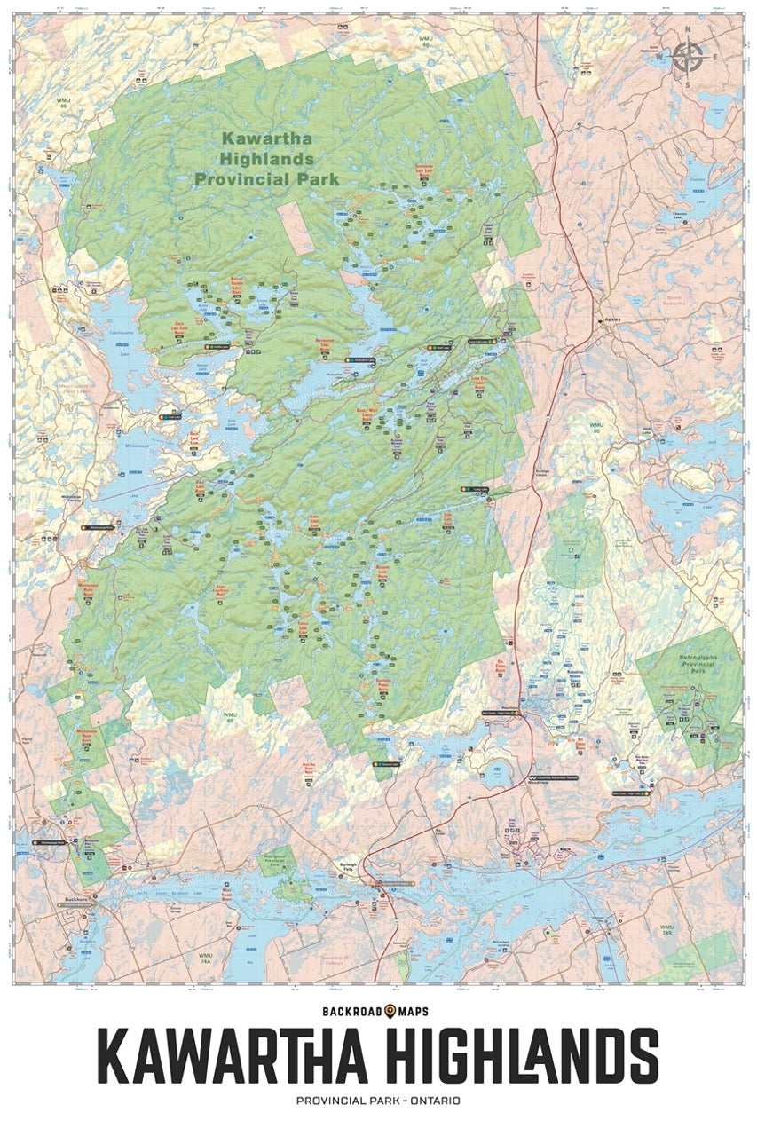 Covering all of Kawartha Highlands Provincial Park, this Ontario topographic recreation map highlights all the paddling routes, backcountry campsites, paddling access points, and portages for canoers, campers, anglers, hikers, and backcountry enthusiasts. Showcasing frontcountry and wilderness campsites, portage locations and distances, boat launches, fishing hotspots, and waterfalls, there is a lifetime of outdoor adventures to be found here. Shown at a 1:50,000 scale, this map features our industry-leading topographic contours and relief shading, as well as roads, padding routes and trails, and ATV and snowmobile areas outside the park. Included on the map are Apsley, Buckhorn, Burleigh Falls, Catchacoma, Anstruther Lake, Buzzard Lake, Chandos Lake, Gold Lake, Mississagua River, Rathbun Lake, Serpentine Lake, Shark Lake, Sucker Lake, Turtle Lake, and more! No other map covers all of Kawartha Highlands Provincial Park with this level of recreation detail.