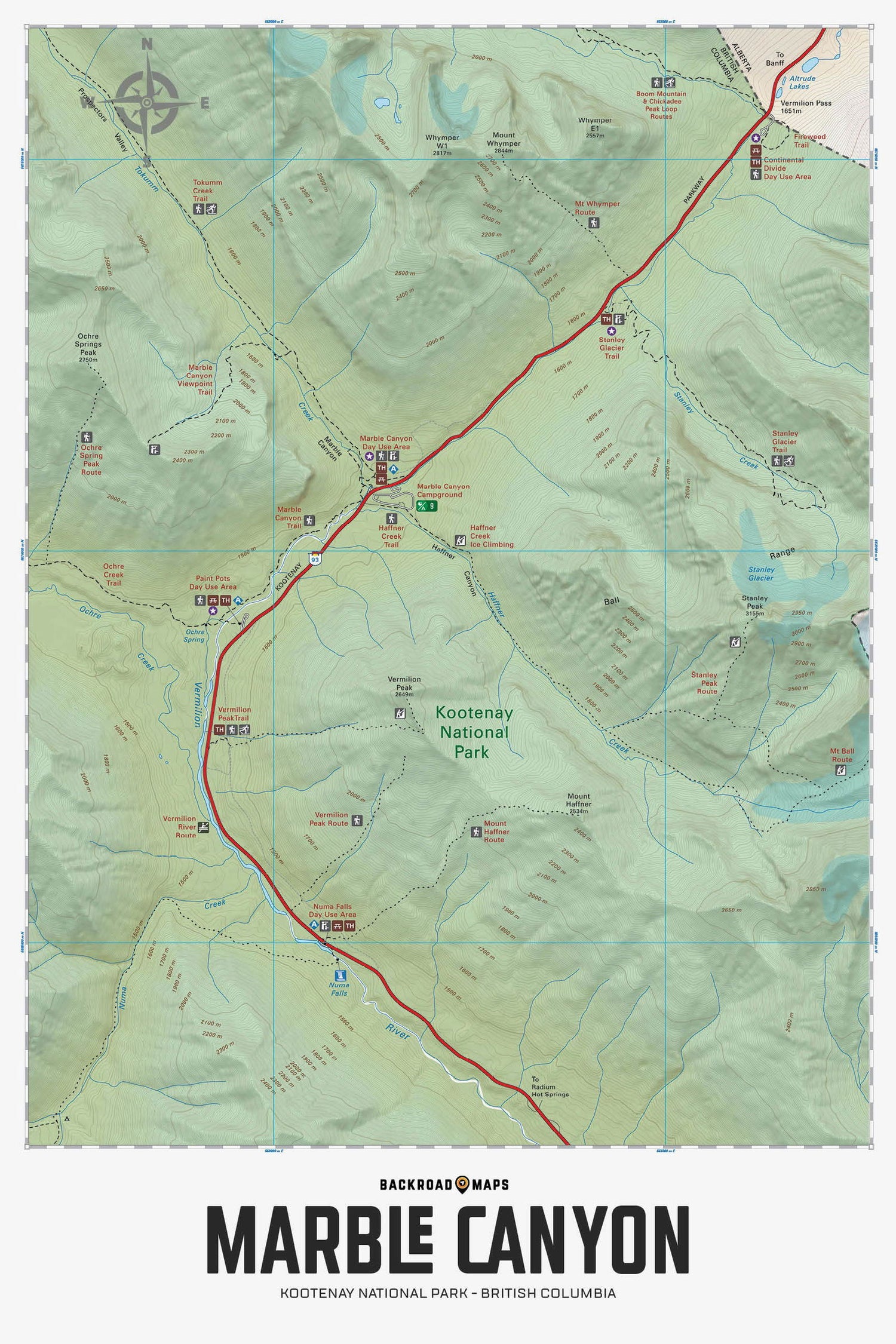 Marble Canyon - Kootenay National Park Map BC Focusing on the Marble Canyon area of Kootenay National Park, this BRMB Adventure topographic map shows you all the access roads, trails for hiking, snowshoeing and cross-country skiing, paddling routes for canoeing and kayaking, picnic sites, campgrounds, viewpoints, backcountry campsites, waterfalls and...