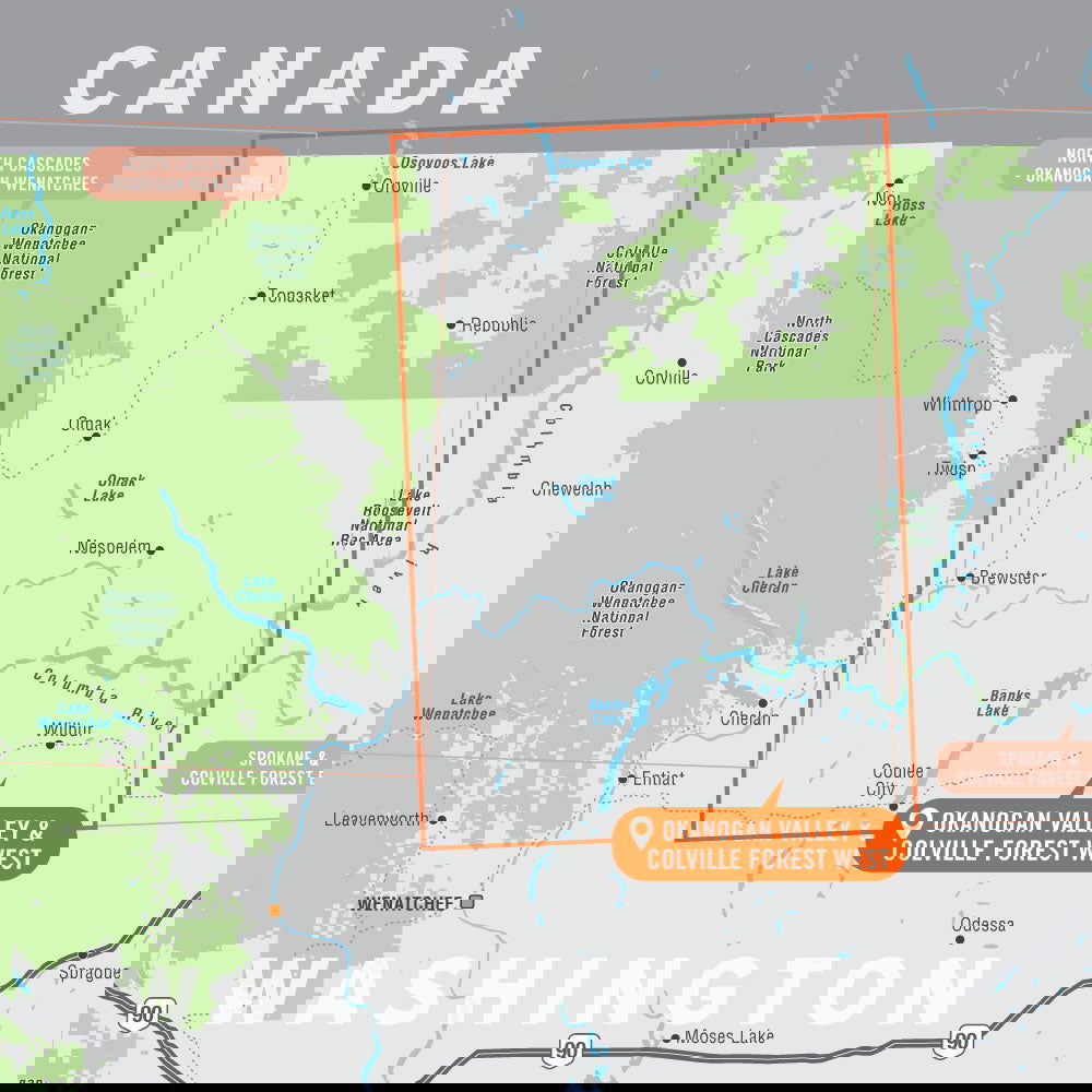 Covering the Okanogan River Valley south to the Grand Coulee area of the Columbia River drainage, this topographic recreation map also includes the eastern and western sides of the Okanogan-Wenatchee and Colville National Forests. This map highlights all nearby access roads, multi-use trails for hikers, mountain bikers, horseback riders, cross-country skiers and snowshoers along with motorized trails for ORVers and snowmobiles, local fishing lakes and rivers, recreation areas, campgrounds, day-use areas, viewpoints, backcountry campsites, backcountry huts and more.
