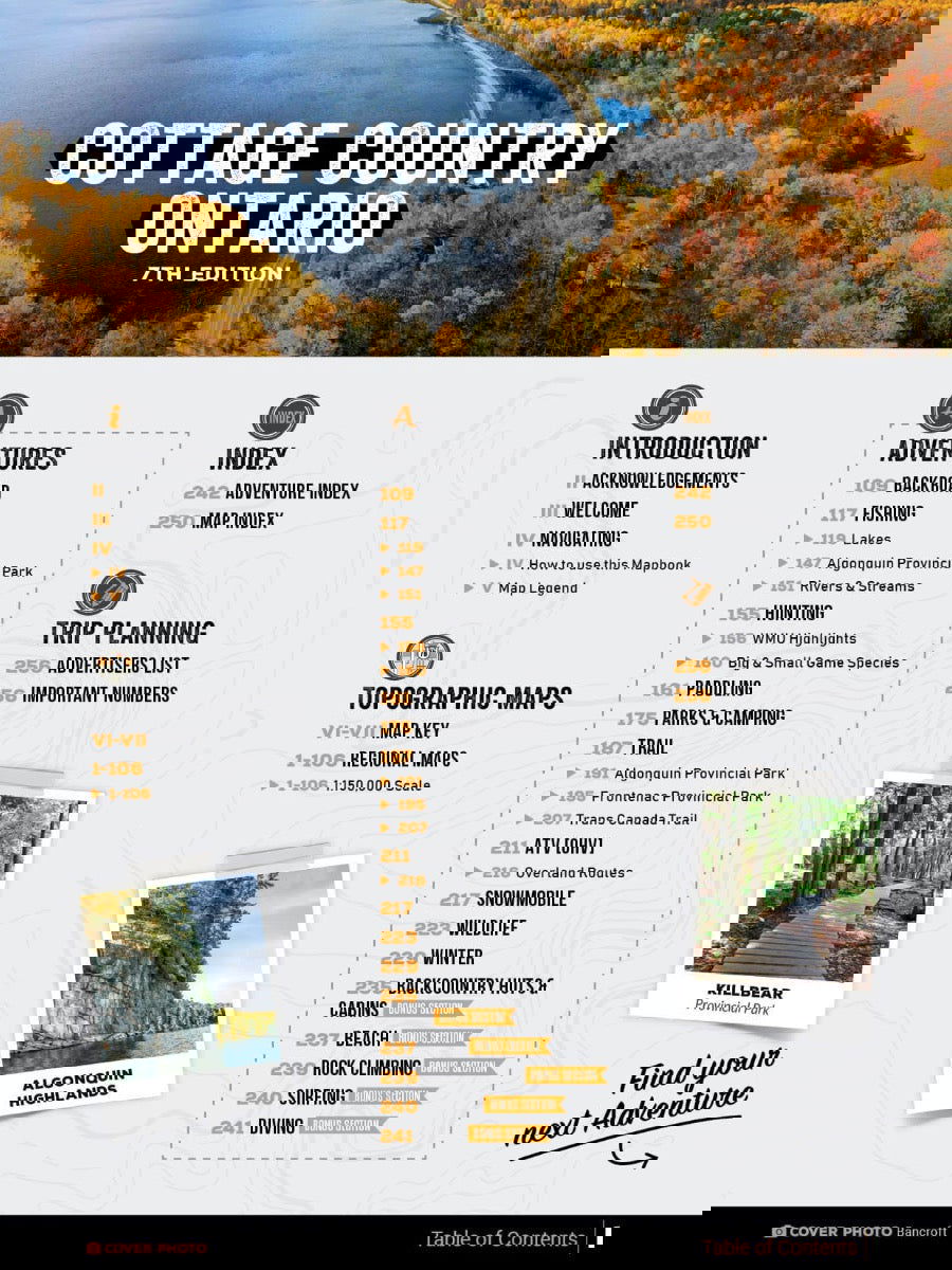 Bonus Adventure SectionsBrand new to the 7th Edition of the Cottage Country Ontario Backroad Mapbook, we feature 34 Backcountry Huts, Cabins, and Shelters, 35 Beaches, 8 Rock Climbing destinations, and 10 Surfing hot spots. No matter where your Cottage Country adventure takes you, we have you covered with some of the best places to relax in the sun, get some exercise, catch a wave, or warm up during a winter adventure.
