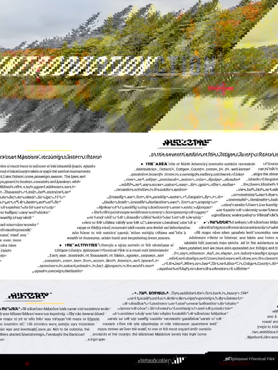 Park AdventuresProtecting some of the most spectacular areas in the province, Cottage Country's extensive park system offers the best of Ontario's outdoor activities, including camping, paddling, hiking, skiing, and more. From well-known parks like Algonquin Provincial Park and Georgian Bay National Park - located in the western section of this book - to Frontenac Provincial Park and Bon Echo Provincial Park - found in the eastern section of this book, you will find over 150 updated listings with detailed descriptions of Provincial, National, and Regional Parks and Conservations Areas. Including the countless amount of smaller and lesser-known parks in between, there is a lot to explore within this region. Notable amenities, easy-to-read activity symbols, camping or day-use information, and park access information are also included within each listing in the Cottage Country Ontario Backroad Mapbook.