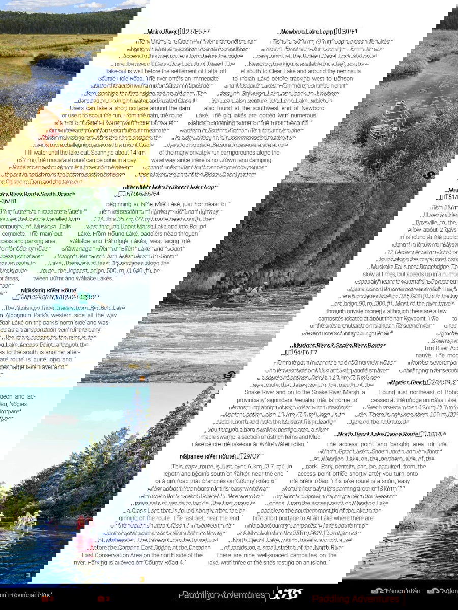 Paddling AdventuresCottage Country is a world-class canoeing and kayaking hotspot and features some of the best lake and river paddling you can find anywhere. Algonquin Park is famous around the world for its canoe tripping and circuit opportunities. However, great paddling can be found throughout the region, from French River to North Bay, to Trenton and beyond. In the latest edition of our Cottage Country Ontario Backroad Mapbook, you will find close to 130 detailed lake and river paddling routes, complete with put-ins, take-outs, portages, difficulty, backcountry campsite locations, and more.