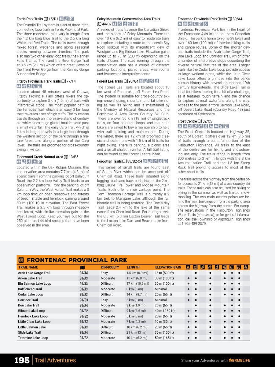 Trail AdventuresWhether you are planning a multi-day trek along the Trans Canada Trail or a scenic day hike in one of Cottage Country's many parks, the new Cottage Country Ontario Backroad Mapbook is packed with over 300 trail listings, including updated trail charts for Algonquin Provincial Park, Frontenac Provincial Park, and the Trans Canada Trail. Explore over 10,000 kilometres of multi-use trails for hiking, biking, horseback riding, winter use, and more, complete with information on trail difficulty, access, distance, elevation gain, and highlights.