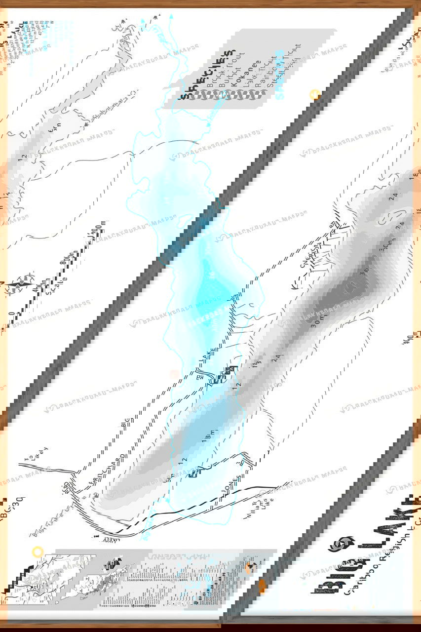 This Fishing Chart covers Big Lake - Williams Lk Area on Cariboo Region, BC. Resting in BC Fishing Region 5, the map features the lake bathymetry (or lake depths) and shore features including boat launches, campsites, fishing docks, parks and resorts. In addition to road or trail access points, the map also includes the lake location and information such as elevation, surface area, mean and maximum depth, and waypoint. Additional features include the fish species found in the lake, an area indicator or map key, scale bar and map legend.