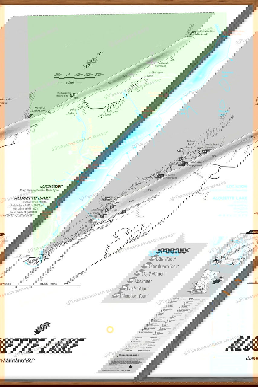 This Fishing Chart covers Alouette Lake on Lower Mainland, BC. Resting in BC Fishing Region 2, the map features the lake bathymetry (or lake depths) and shore features including boat launches, campsites, fishing docks, parks and resorts. In addition to road or trail access points, the map also includes the lake location and information such as elevation, surface area, mean and maximum depth, and waypoint. Additional features include the fish species found in the lake, an area indicator or map key, scale bar and map legend.