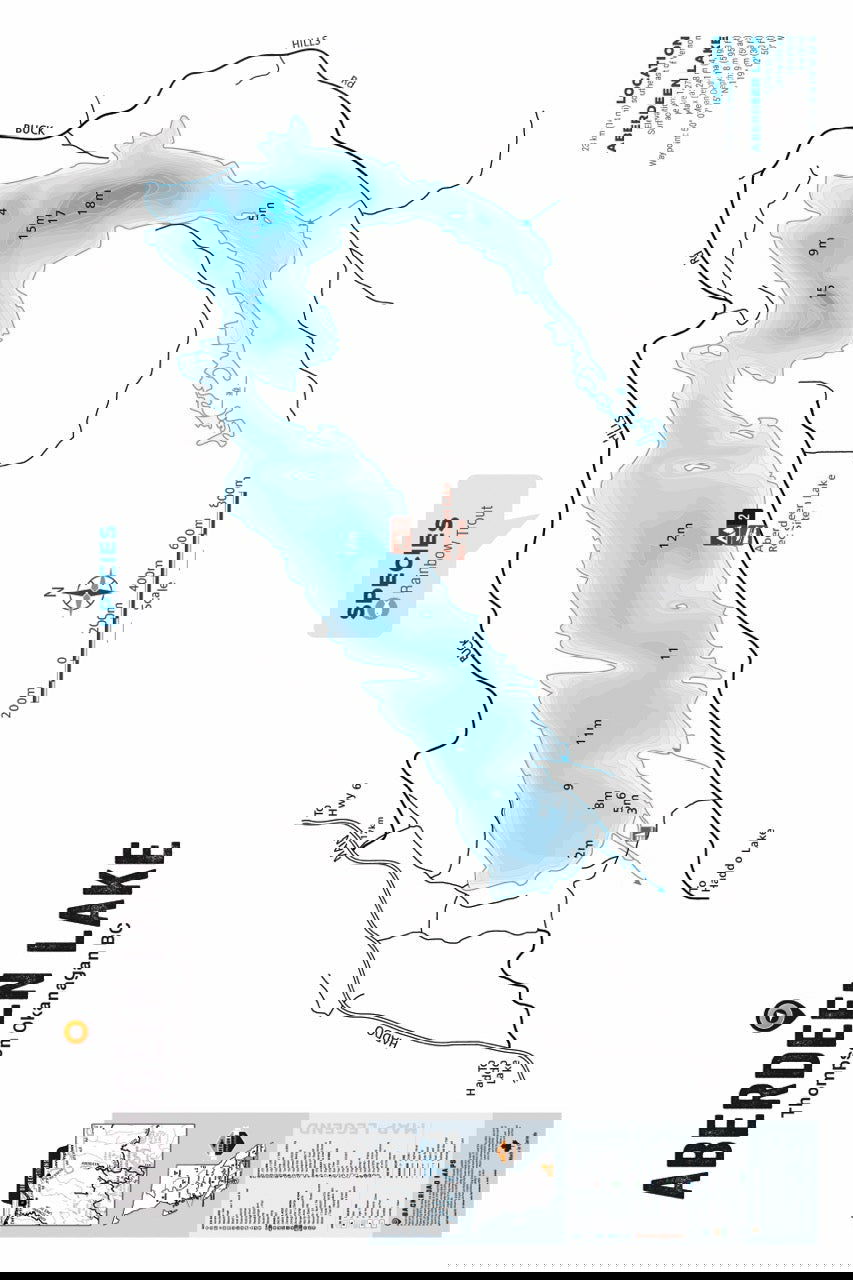 This Fishing Chart covers Aberdeen Lake on Thompson Okanagan, BC. Resting in BC Fishing Region 8, the map features the lake bathymetry (or lake depths) and shore features including boat launches, campsites, fishing docks, parks and resorts. In addition to road or trail access points, the map also includes the lake location and information such as elevation, surface area, mean and maximum depth, and waypoint. Additional features include the fish species found in the lake, an area indicator or map key, scale bar and map legend.