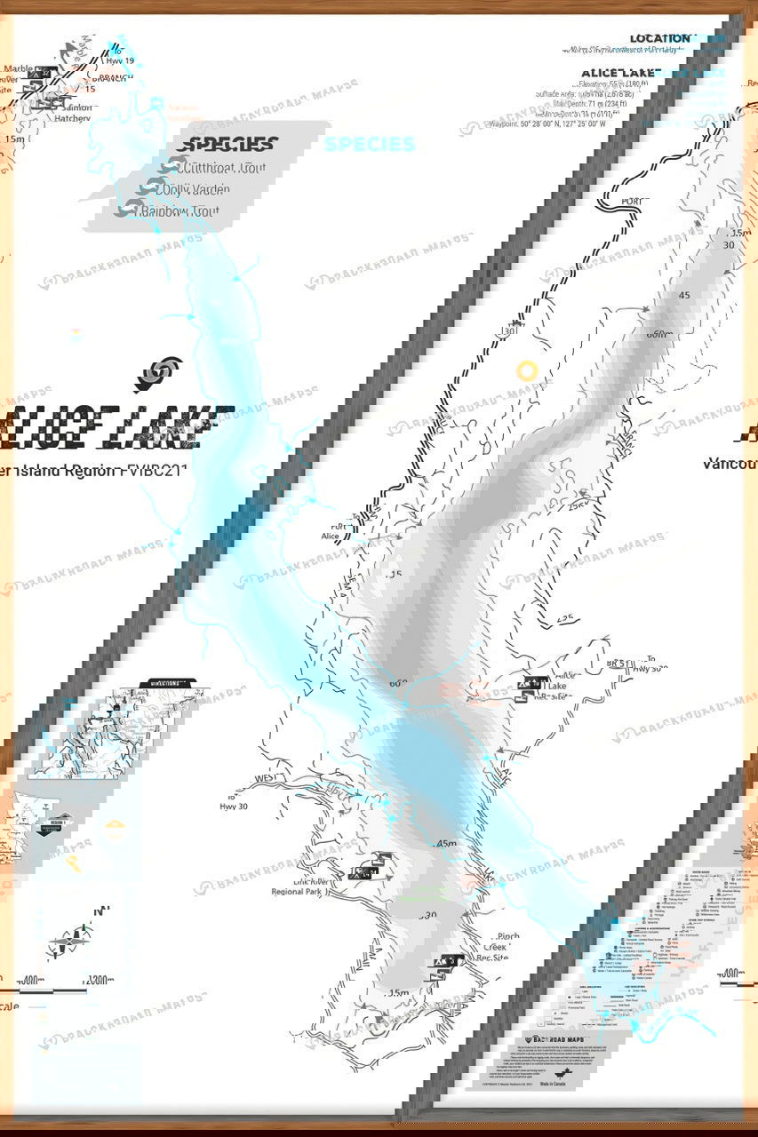 This Fishing Chart covers Alice Lake on Vancouver Island, BC. Resting in BC Fishing Region 1, the map features the lake bathymetry (or lake depths) and shore features including boat launches, campsites, fishing docks, parks and resorts. In addition to road or trail access points, the map also includes the lake location and information such as elevation, surface area, mean and maximum depth, and waypoint. Additional features include the fish species found in the lake, an area indicator or map key, scale bar and map legend.