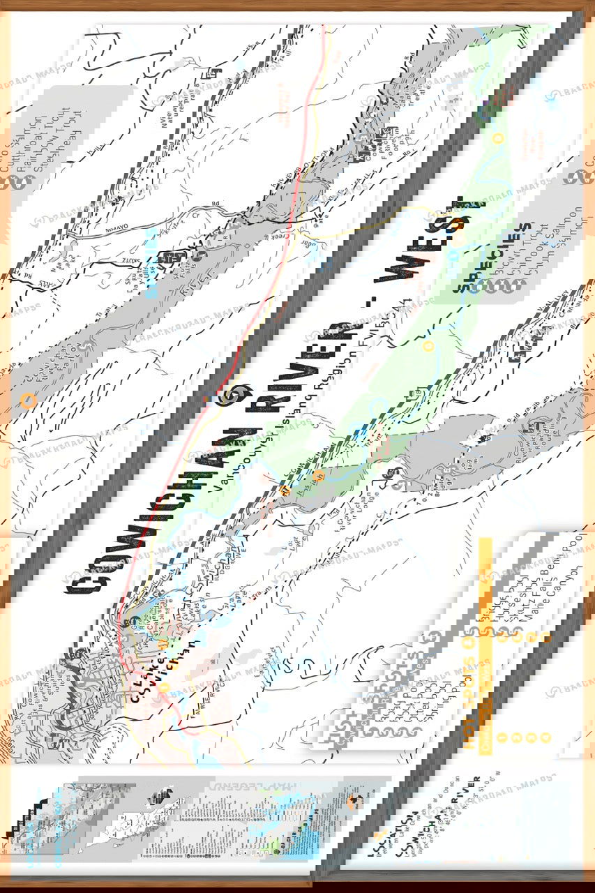 This Fishing Chart covers the west side of Cowichan River on Vancouver Island, BC. Resting in BC Fishing Region 1, the map features the lake bathymetry (or lake depths) and shore features including boat launches, campsites, fishing docks, parks and resorts. In addition to road or trail access points, the map also includes the lake location and information such as elevation, surface area, mean and maximum depth, and waypoint. Additional features include the fish species found in the lake, an area indicator or map key, scale bar and map legend.