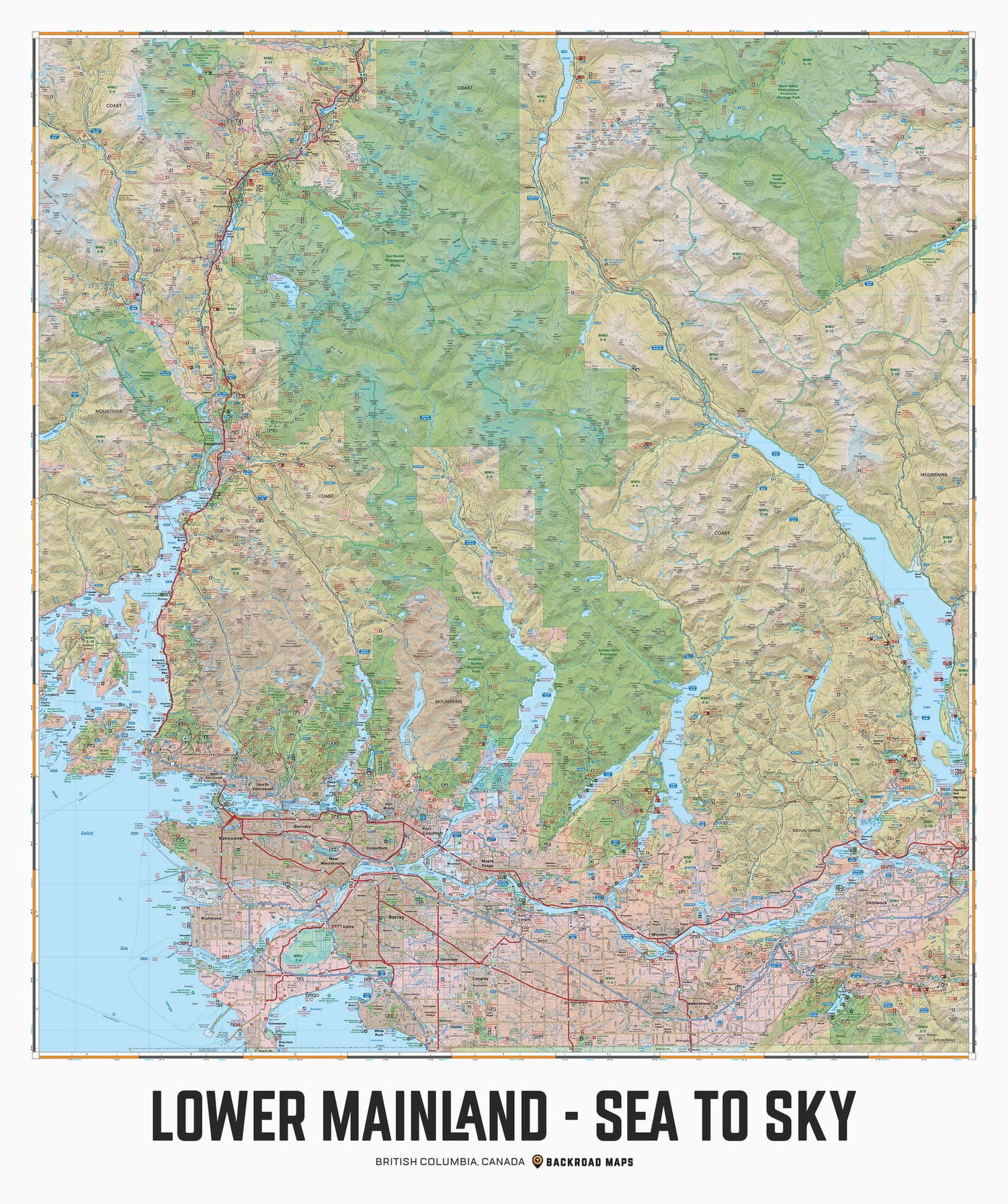 Covering the Lower Mainland and Sea to Sky areas, this custom designed map has been created to display nicely on your home, cabin or office wall. The map has been produced using the ever-popular Backroad Mapbook series of maps and showcases this popular area of British Columbia, Canada like never before. Featuring all the roads, trails and recreational hot spots in the Lower Mainland of BC, this map has been modified to fit nicely into common picture frame sizes. Printed on a durable synthetic material, the map includes Abbotsford, Allison Lake, Chilliwack, Coquitlam, Cypress Provincial Park, Garibaldi Provincial Park, Harrison Hot Springs, Harrison Lake, Maple Ridge, Pitt Lake, Squamish, Stave Lake, Vancouver, Whistler and more!