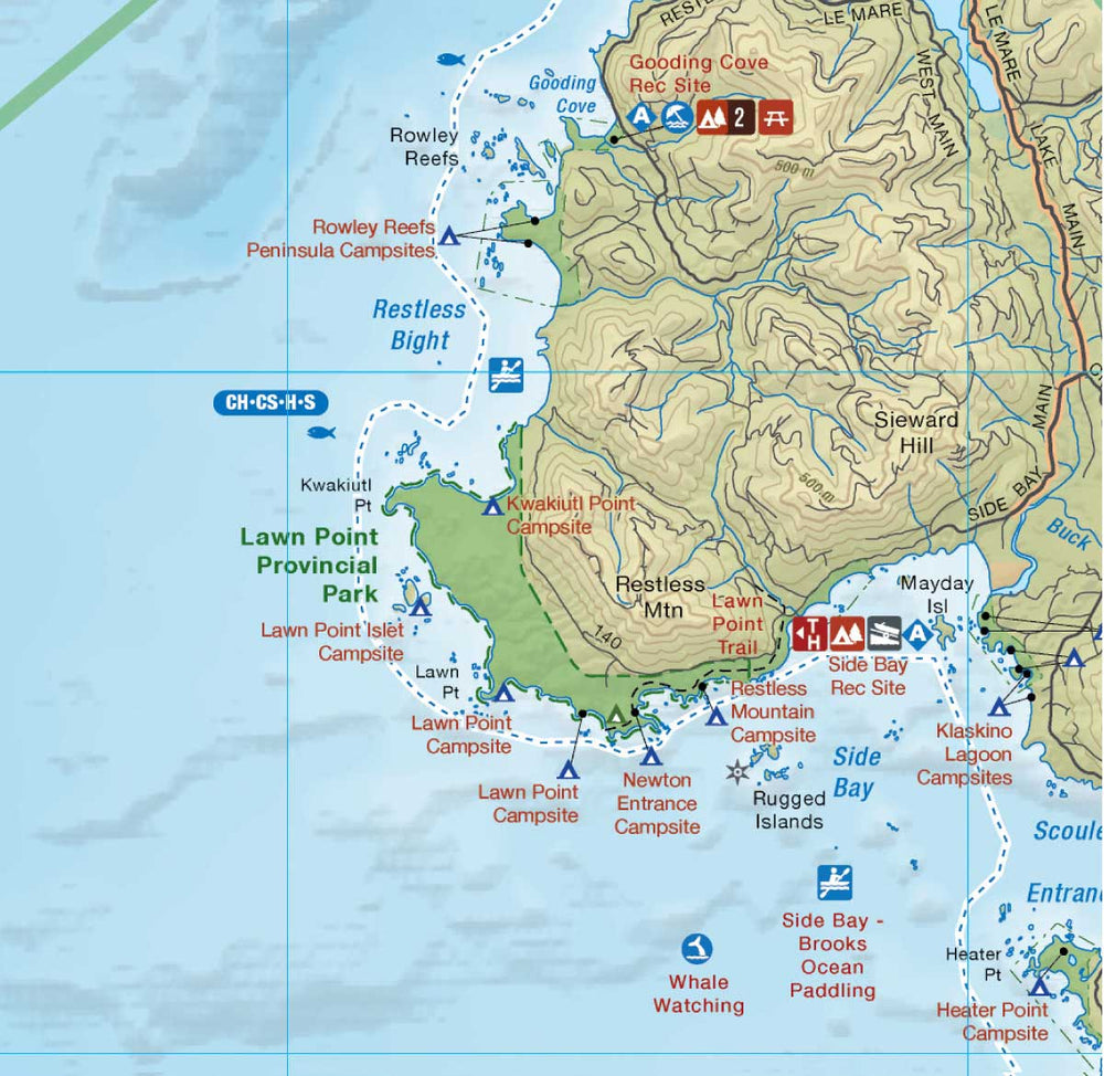 This recreation topographic map for Northwestern Vancouver Island BC highlights all the roads, fishing lakes & streams, front and backcountry campsites, paddling routes for canoeing and kayaking, wildlife viewing areas, multi-use trails for hiking, backcountry skiing, snowshoeing, mountain biking, horseback riding & more. Using 1:50,000 scale water and road data, this map is available in various wall map sizes, providing you with more topographic and recreational detail for the area than any other map on the market. Special features include private land and countless roads, trails and recreational Points of Interest.