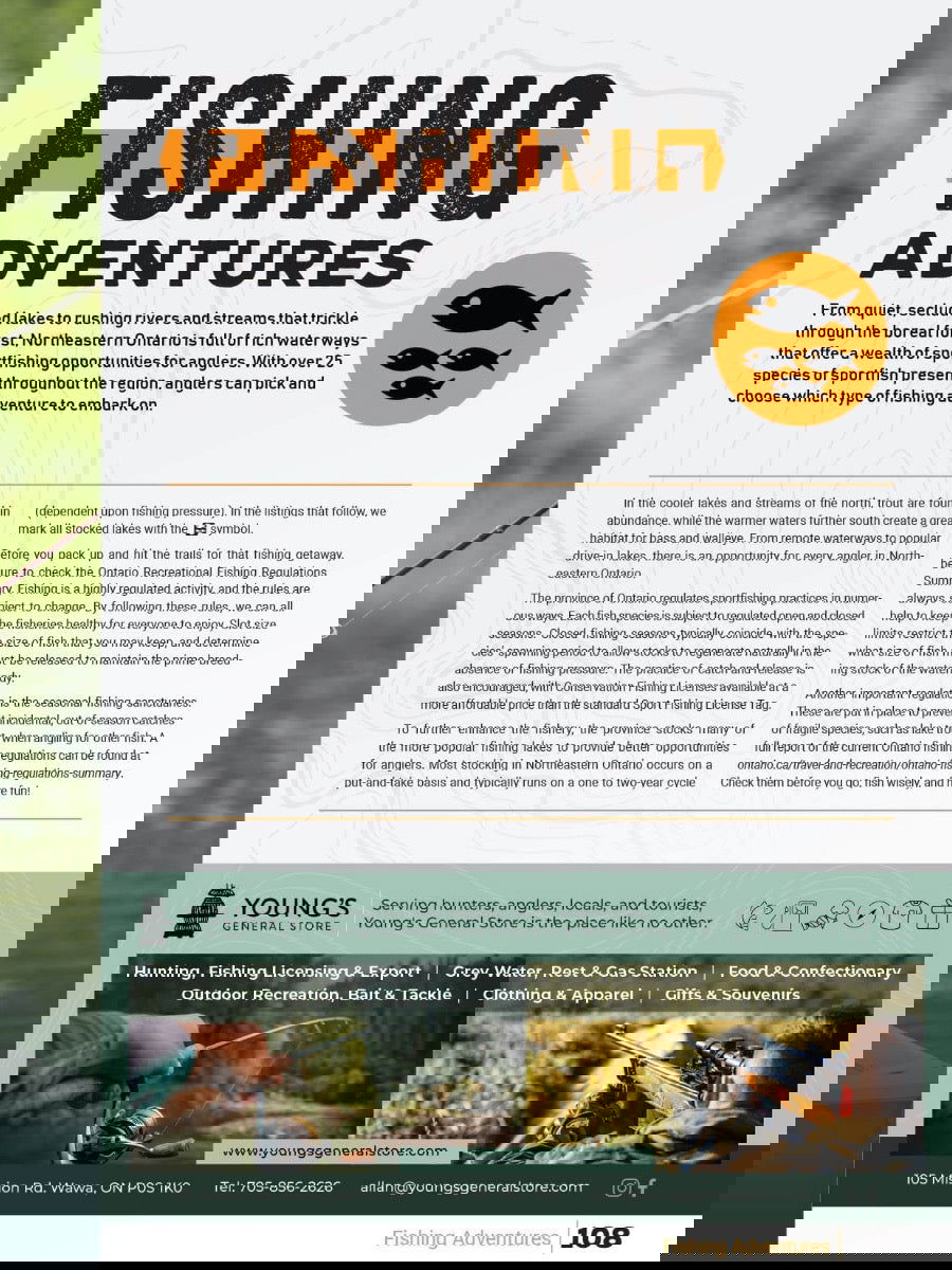 Fishing AdventuresNortheastern Ontario is home to some incredibly rich waterways that support over 25 different species of sportfish. From the clean and shallow waters of Kabinakagami Lake to the Chapleau, French and Steel Rivers, there are endless opportunities for angling here. The 6th Edition Northeastern Ontario Backroad Mapbook contains close to 1,290 listings for the best places to fish in the region, complete with information on access, species, regulations, stocking charts and more. The maps also showcase the fish species on hundreds of more fishing lakes and streams.