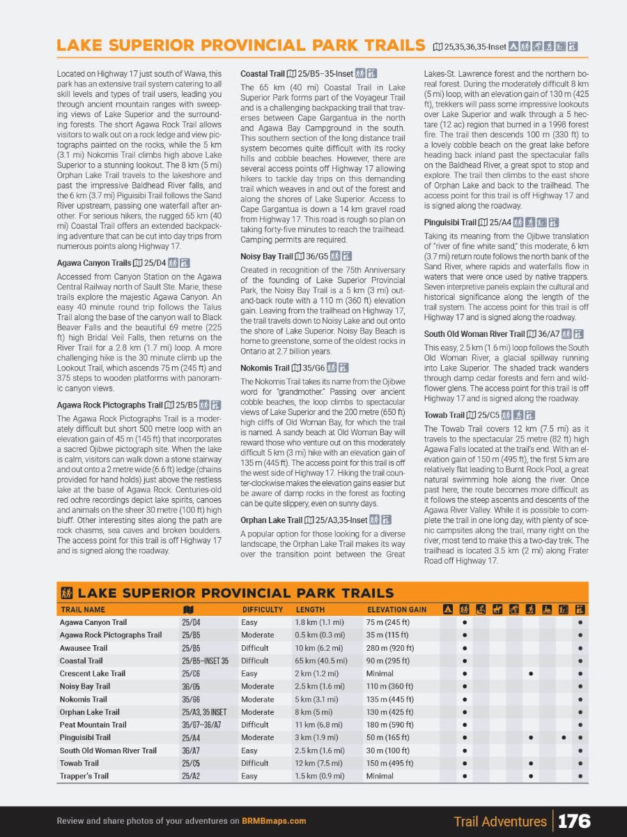 Trail AdventuresFrom long-distance multi-day treks through remote boreal forests to casual riverfront strolls and short day hikes through a provincial park, Northeastern Ontario has a wide range of trail options for all types of explorers. In this Mapbook you will find nearly 180 detailed trail listings including information on distance, elevation gain, access, and highlights as well as trail charts for the Voyageur and Trans-Canada Trails and the more popular parks and routes including Killarney, Lake Superior, Pukaskwa. From the scenic trails of the Lake Superior Provincial Park to the beautiful Georgian Bay Coast Trail and the Voyageur Hiking Trail, this Mapbook lists them all. And if you are looking for a challenge, read up on the Group of Seven Lake Superior Trail: 42 km (26 miles) from Neys National Park to Pukaskwa National Park.