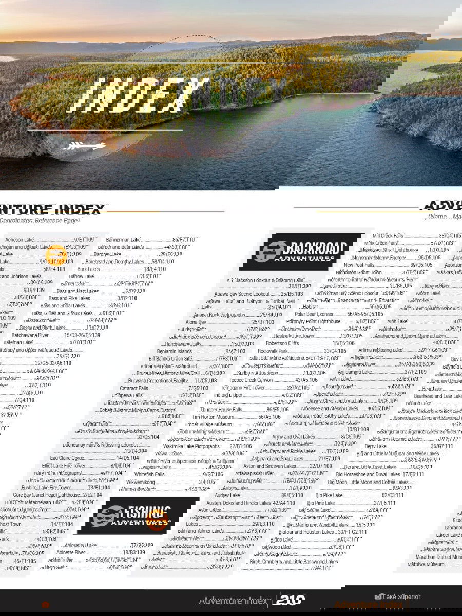IndexOur easy-to-use index is divided into Map and Adventure sections to make it easy to navigate. You will find page numbers and map coordinates for each activity and location, plus important numbers, distance charts and an advertiser list for easy referencing.