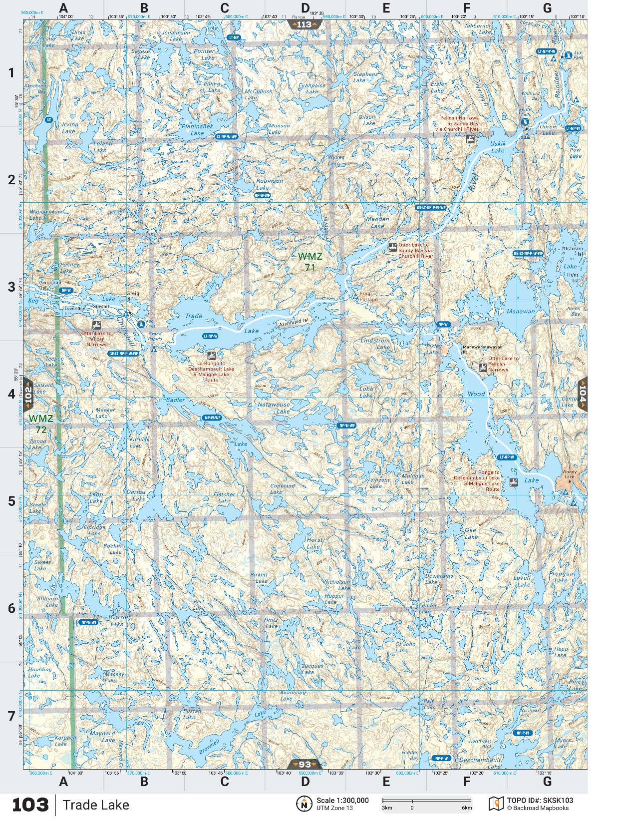 This recreation topographic map for the Trade Lake area highlights all the logging and resource roads, multi-use trails for hikers, mountain bikers, horseback riders, cross-country skiers and snowshoers, motorized trails for ATVers and snowmobilers, fishing lakes and rivers, recreation areas, campgrounds, day-use areas, viewpoints, backcountry campsites, work camps, oil & gas sites and more. No other map for the area provides you with this level of recreational or topographic detail. Covering 4,450 km2 (1,620 mi2) in total, this 1:100,000 scale map measures 58 x 77 km (36 x 48 mi). Special features include the addition of Oil & Gas information, including gas plants, disposal and compressor stations and updated seismic line corridors, the addition of Municipal Regional District Boundaries, new lake data and more. This map includes Fort Portage, Trade Lake, Wood Lake, Manawari Lake, Sadler Lake, Brownell Lake, Deschambault Lake, Lovell Lake, Churchill River and more! This map also covers the following Wildlife Management Units: WMZ 50, WMZ 63, WMZ 64, WMZ 65, WMZ 66. Frog Portage - Saskatchewan comes printed on waterproof synthetic material for extra durability.
