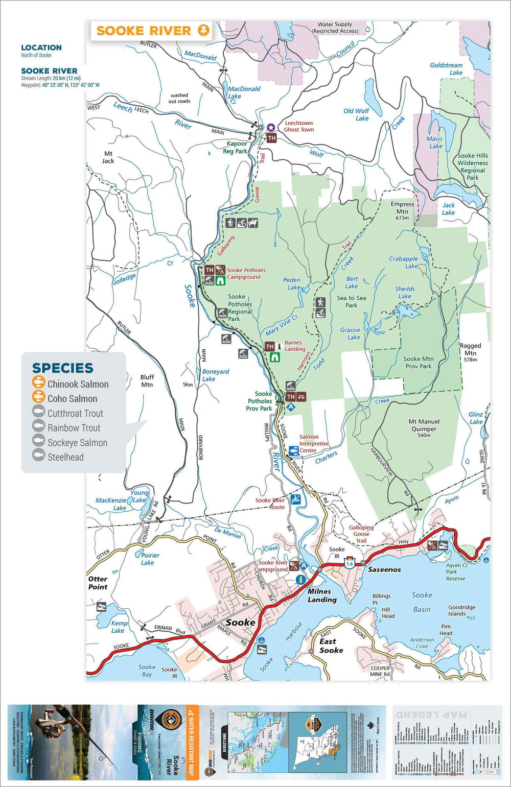 This Fishing Chart covers Sooke River on Vancouver Island, BC. Resting in BC Fishing Region 1, the map features the lake bathymetry (or lake depths) and shore features including boat launches, campsites, fishing docks, parks and resorts. In addition to road or trail access points, the map also includes the lake location and information such as elevation, surface area, mean and maximum depth, and waypoint. Additional features include the fish species found in the lake, an area indicator or map key, scale bar and map legend.